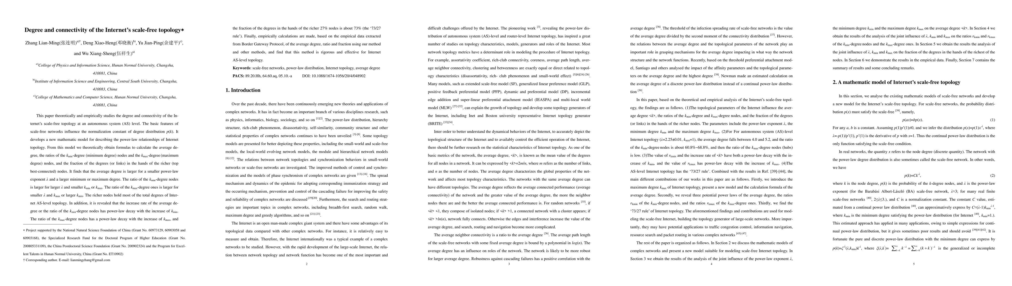 This paper develops a mathematical model to study the degree and connectivity of the Internet's scale-free topology at the autonomous system level, deriving formulas for average degree and the distribution of minimum and maximum degree nodes. It finds that the average degree is influenced by the power-law exponent, and the richer nodes hold most of the total degrees, confirming the '73/27 rule' empirically.