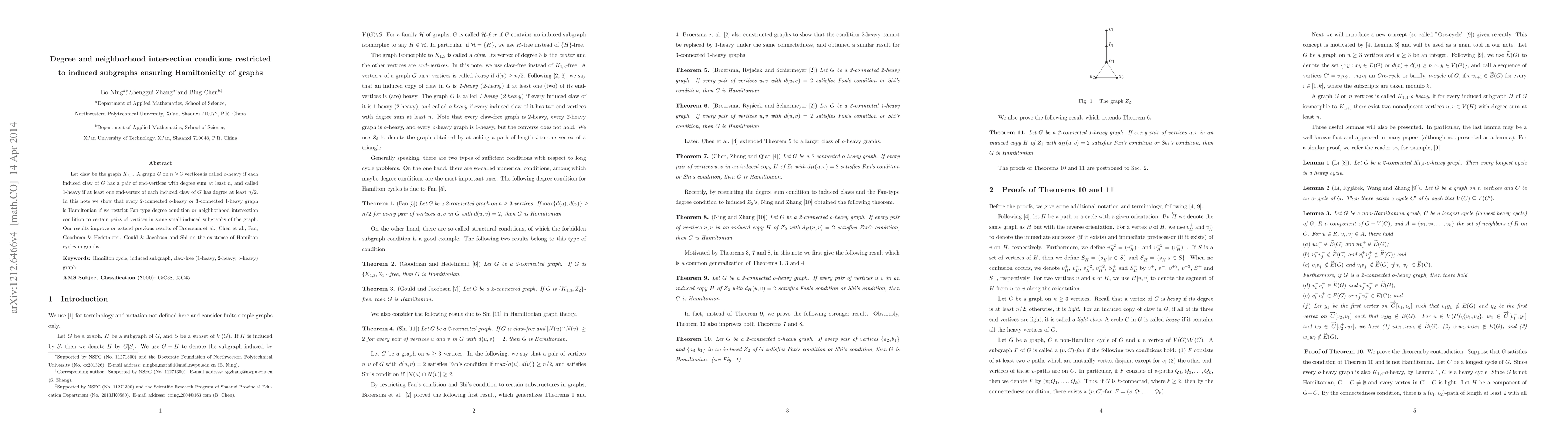This paper investigates conditions ensuring Hamiltonicity in graphs, specifically focusing on "o-heavy" and "1-heavy" graphs. It demonstrates that certain degree and neighborhood intersection conditions applied to small induced subgraphs guarantee the existence of Hamilton cycles in 2-connected "o-heavy" or 3-connected "1-heavy" graphs, improving upon previous results in the field.