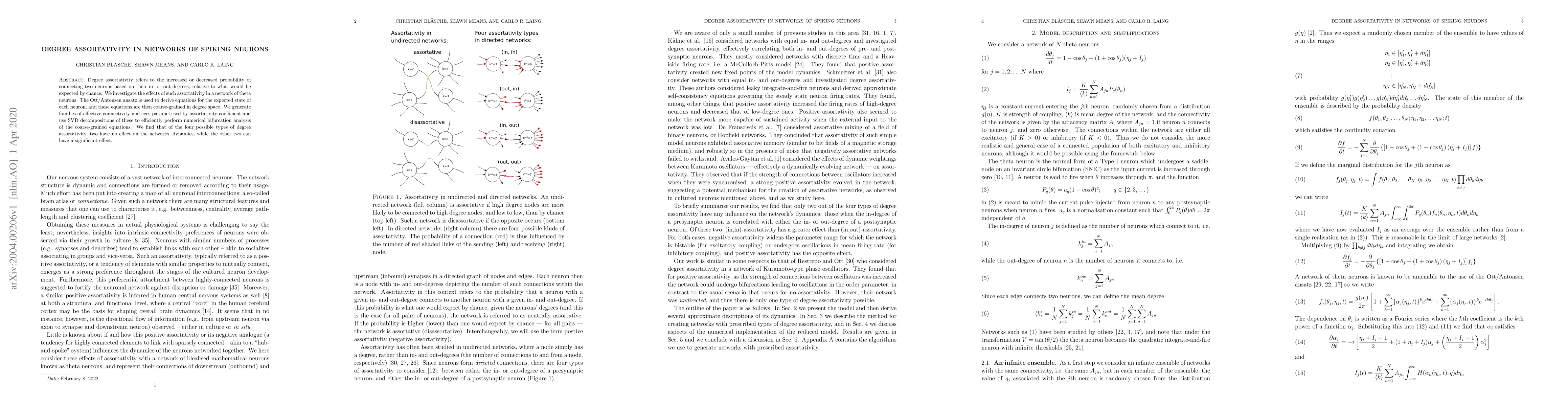 This paper examines how degree assortativity in networks of spiking theta neurons influences their dynamics, using the Ott/Antonsen ansatz and numerical bifurcation analysis. It finds that while two types of assortativity have no effect, the other two can significantly alter the network's behavior.
