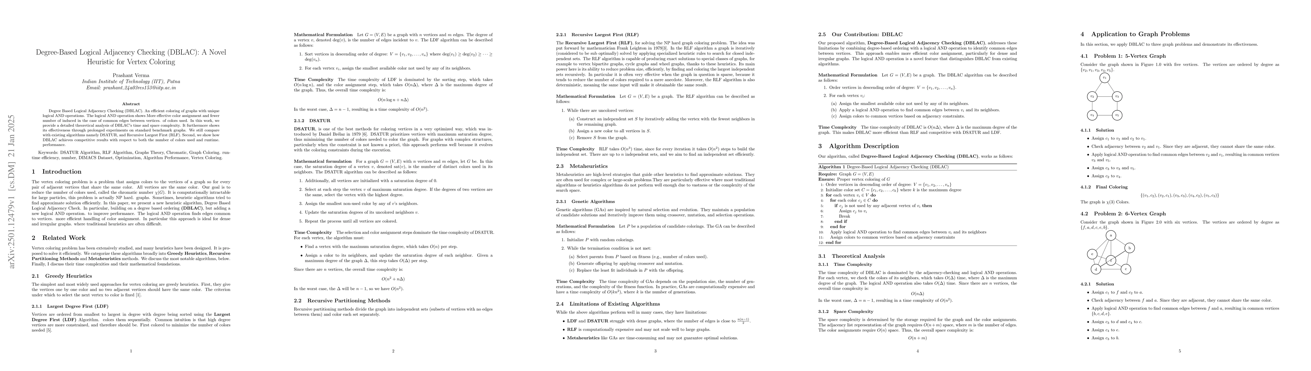 This paper introduces Degree-Based Logical Adjacency Checking (DBLAC), a novel heuristic for vertex coloring using logical AND operations, which demonstrates effective color assignment and fewer induced colors. The study presents a theoretical analysis of DBLAC’s complexity and compares its performance against existing algorithms DSATUR and RLF, showing competitive results in both color count and runtime.