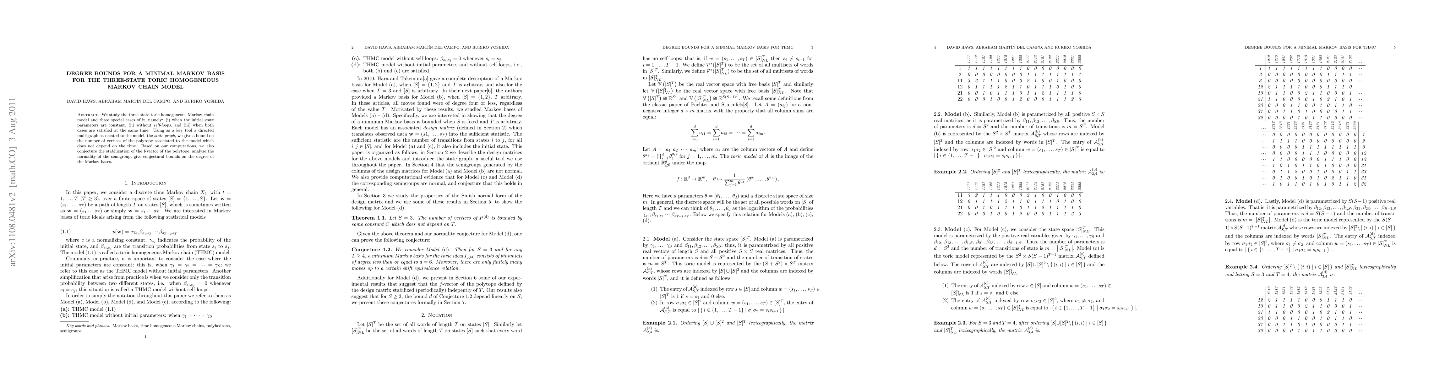 This research paper analyzes the three-state toric homogeneous Markov chain model and its special cases. It introduces a directed multigraph, the state-graph, to bound the number of vertices of the associated polytope, independent of time. The study also presents conjectures on the f-vector stabilization, semigroup normality, and degree bounds of the Markov bases.
