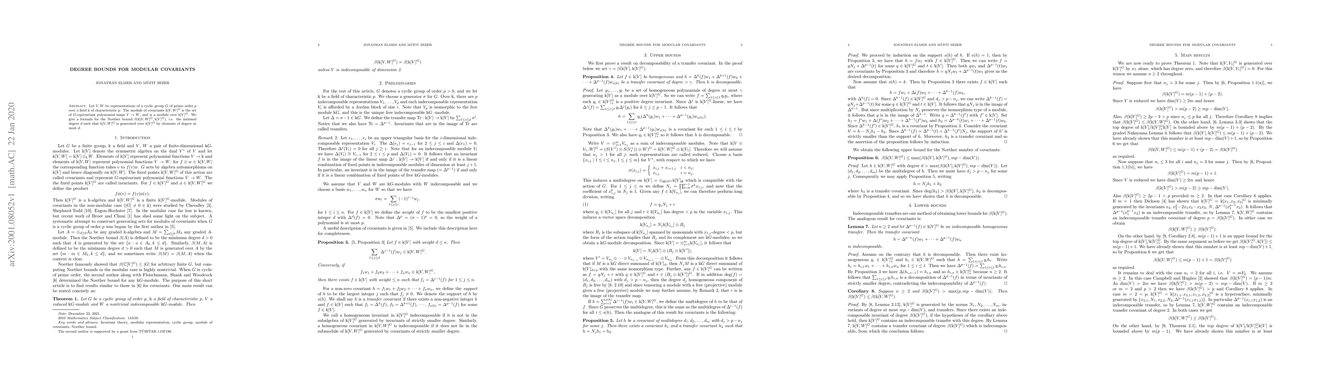 This research paper finds a formula for the Noether bound of the module of covariants k[V,W]^G over a cyclic group G of prime order p, establishing bounds on the degree of generators required to generate this module over k[V]^G.