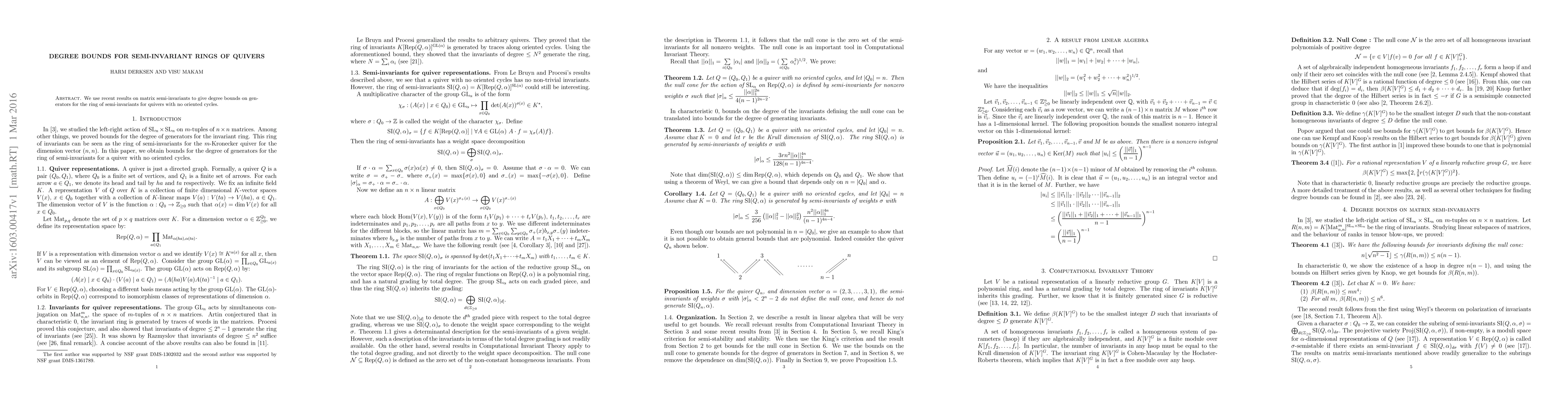 Summary: This paper establishes degree bounds for generators of the semi-invariant ring associated with quivers devoid of oriented cycles, leveraging recent advancements in matrix semi-invariants. The findings provide a structured understanding of the algebraic properties of these rings.