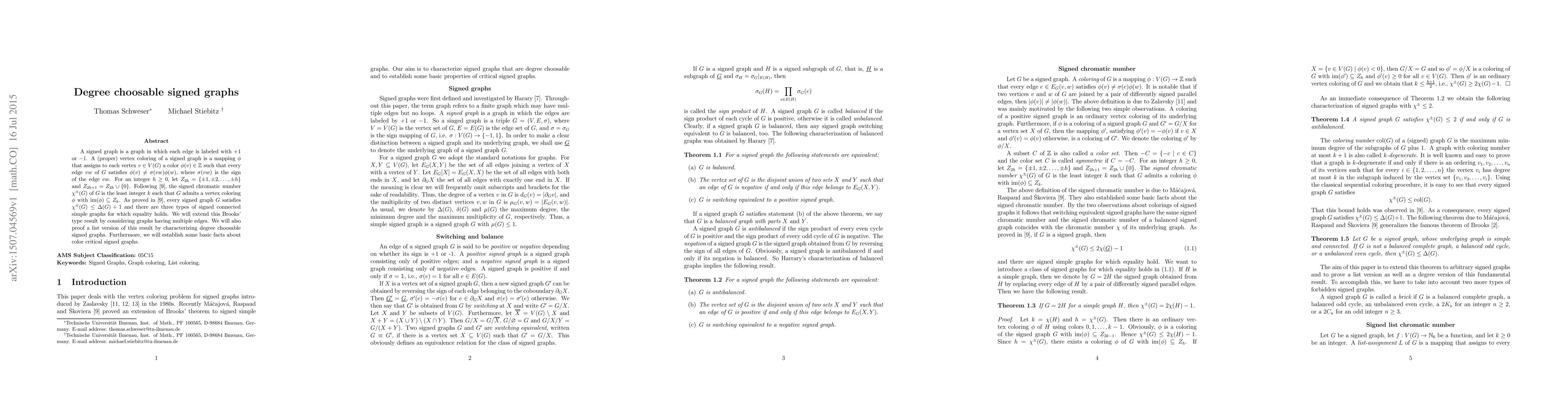A signed graph is a graph in which each edge is labeled with $+1$ or $-1$. A (proper) vertex coloring of a signed graph is a mapping $\f$ that assigns to each vertex $v\in V(G)$ a color $\f(v)\in \mz$ such that every edge $vw$ of $G$ satisfies $\f(v)\not= \sg(vw)\f(w)$, where $\sg(vw)$ is the sign of the edge $vw$. For an integer $h\geq 0$, let $\Ga_{2h}=\{\pm1,\pm2, \ldots, \pm h\}$ and $\Ga_{2h+1}=\Ga_{2h} \cup \{0\}$. Following \cite{MaRS2015}, the signed chromatic number $\scn(G)$ of $G$ is the least integer $k$ such that $G$ admits a vertex coloring $\f$ with ${\rm im}(\f)\subseteq \Ga_k$. As proved in \cite{MaRS2015}, every signed graph $G$ satisfies $\scn(G)\leq \De(G)+1$ and there are three types of signed connected simple graphs for which equality holds. We will extend this Brooks' type result by considering graphs having multiple edges. We will also proof a list version of this result by characterizing degree choosable signed graphs. Furthermore, we will establish some basic facts about color critical signed graphs.