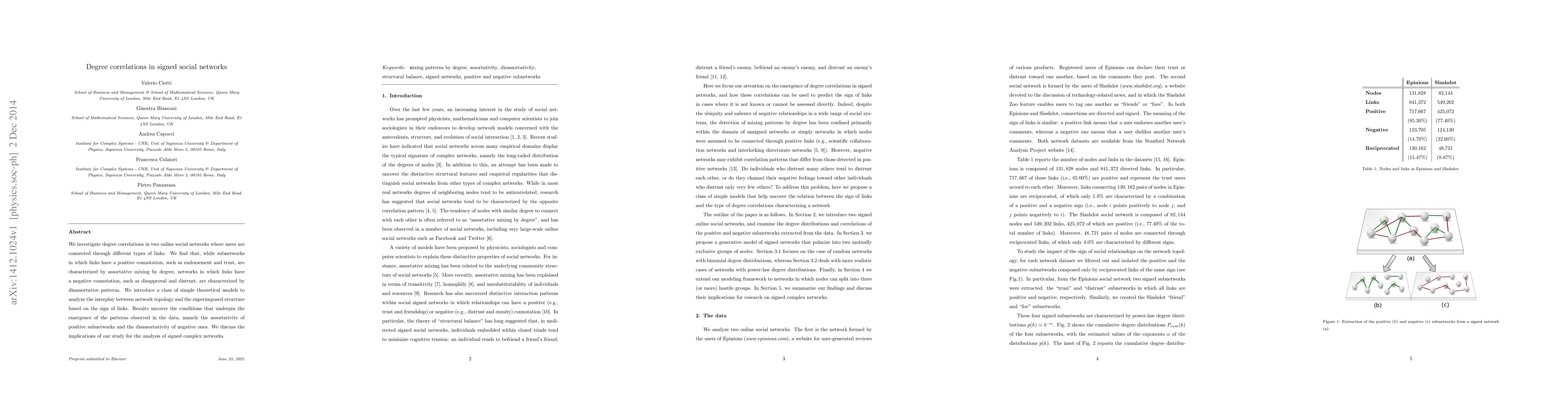 This paper examines degree correlations in online social networks with positive and negative links, finding that positive subnetworks exhibit assortative mixing while negative ones show disassortative patterns. Theoretical models reveal the conditions leading to these observed patterns, with implications for understanding the structure of signed complex networks.
