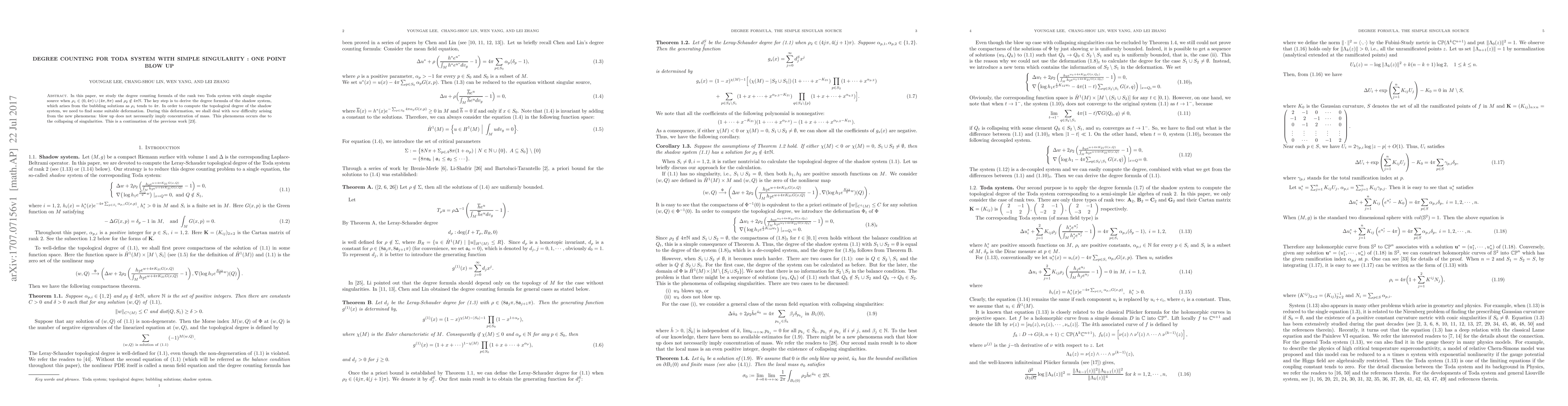 In this paper, we study the degree counting formula of the rank two Toda system with simple singular source when $\rho_1\in(0,4\pi)\cup(4\pi,8\pi)$ and $\rho_2\notin 4\pi\mathbb{N}.$ The key step is to derive the degree formula of the shadow system, which arises from the bubbling solutions as $\rho_1$ tends to $4\pi$. In order to compute the topological degree of the shadow system, we need to find some suitable deformation. During this deformation, we shall deal with \textit{new} difficulty arising from the new phenomena: blow up does not necessarily imply concentration of mass. This phenomena occurs due to the collapsing of singularities. This is a continuation of the previous work Lee, Lin, Wei and Yang.