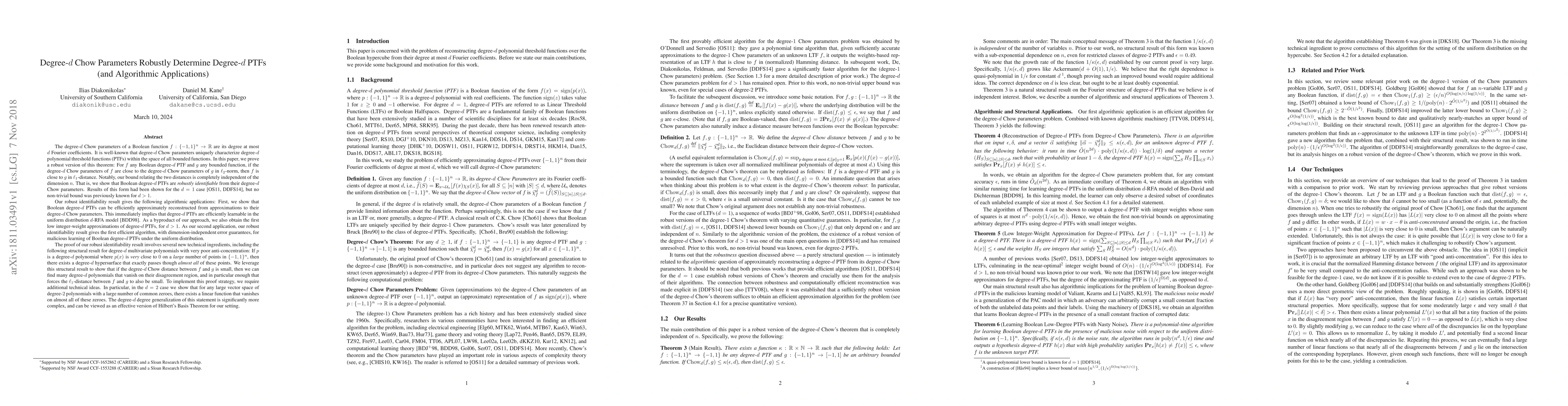 This research paper proves that degree-d Chow parameters uniquely identify degree-d polynomial threshold functions (PTFs), a result that holds even when the parameters are close but with some error. This robust identifiability is independent of dimension n and has algorithmic implications, such as efficient approximation reconstruction of PTFs from approximated Chow parameters and learnability in the uniform distribution d-RFA model. The paper also provides the first low integer-weight approximations for degree-d PTFs (for d>1) and an efficient, dimension-independent algorithm for malicious learning of Boolean degree-d PTFs under the uniform distribution.