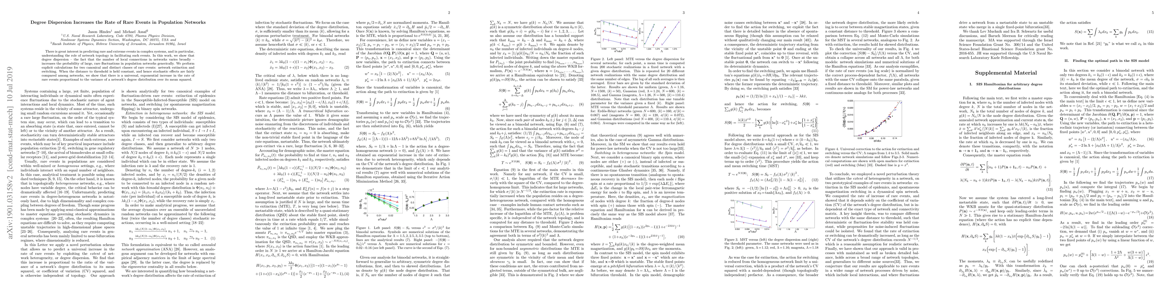 This paper demonstrates that degree dispersion in population networks enhances the likelihood of rare, large fluctuations, such as network extinction and switching. It shows a universal, exponential increase in the rate of these rare events proportional to the variance in the network's degree distribution relative to its mean squared.