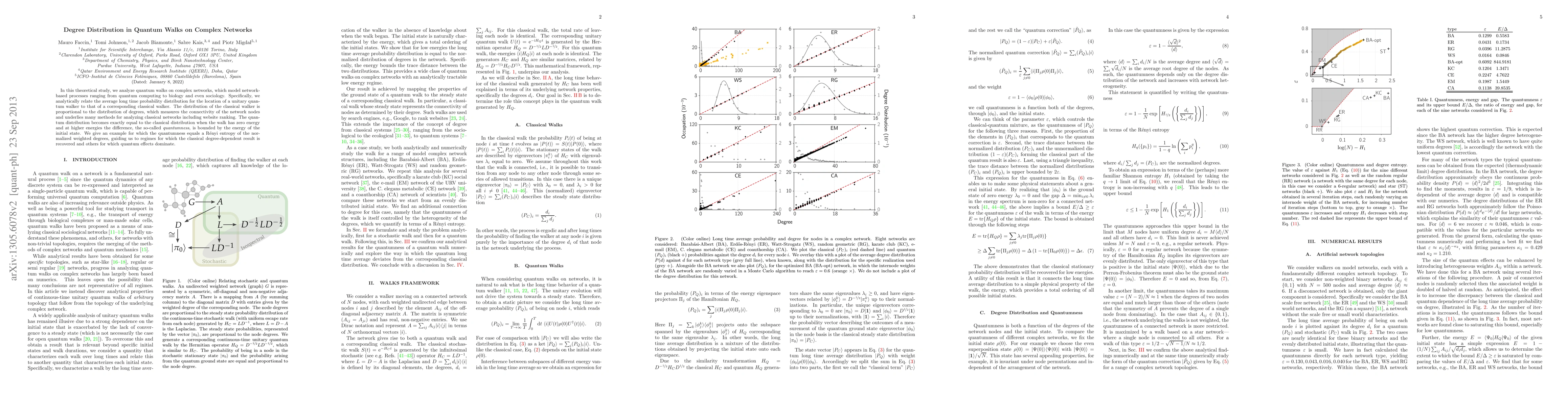 This paper investigates the degree distribution in quantum walks on complex networks, showing that the quantum walker's long-time probability distribution aligns with the classical degree-based distribution when energy is zero. At higher energies, quantum effects diverge, quantified by the quantumness, which is bounded by the initial state's energy.