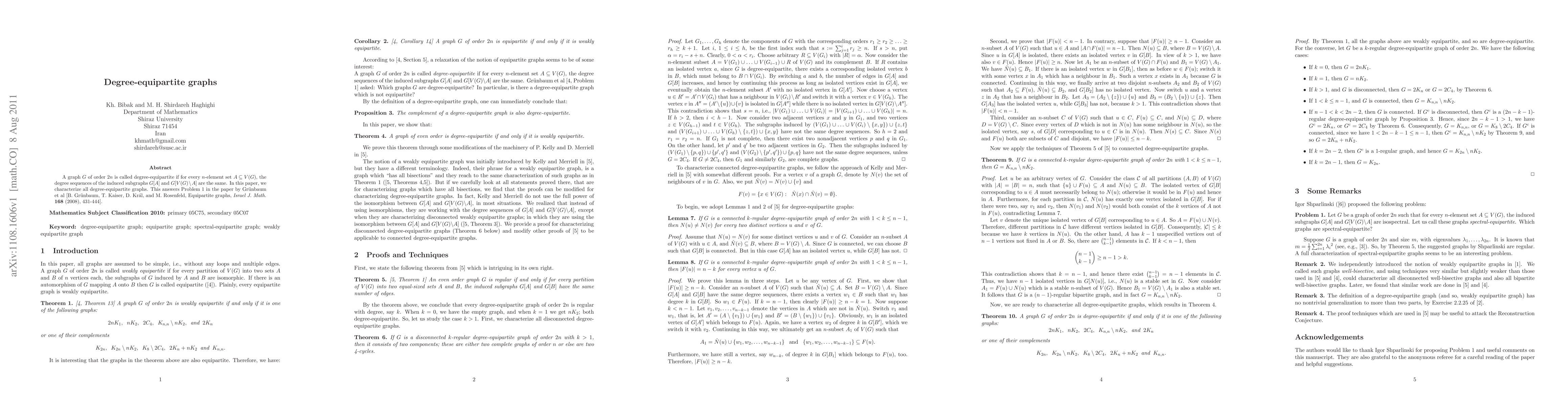 A graph $G$ of order $2n$ is called degree-equipartite if for every $n$-element set $A\subseteq V(G)$, the degree sequences of the induced subgraphs $G[A]$ and $G[V(G)\setminus A]$ are the same. In this paper, we characterize all degree-equipartite graphs. This answers Problem 1 in the paper by Gr\"{u}nbaum et al [B. Gr\"{u}nbaum, T. Kaiser, D. Kr\'{a}l, and M. Rosenfeld, Equipartite graphs, {\it Israel J. Math.} {\bf 168} (2008), 431-444].