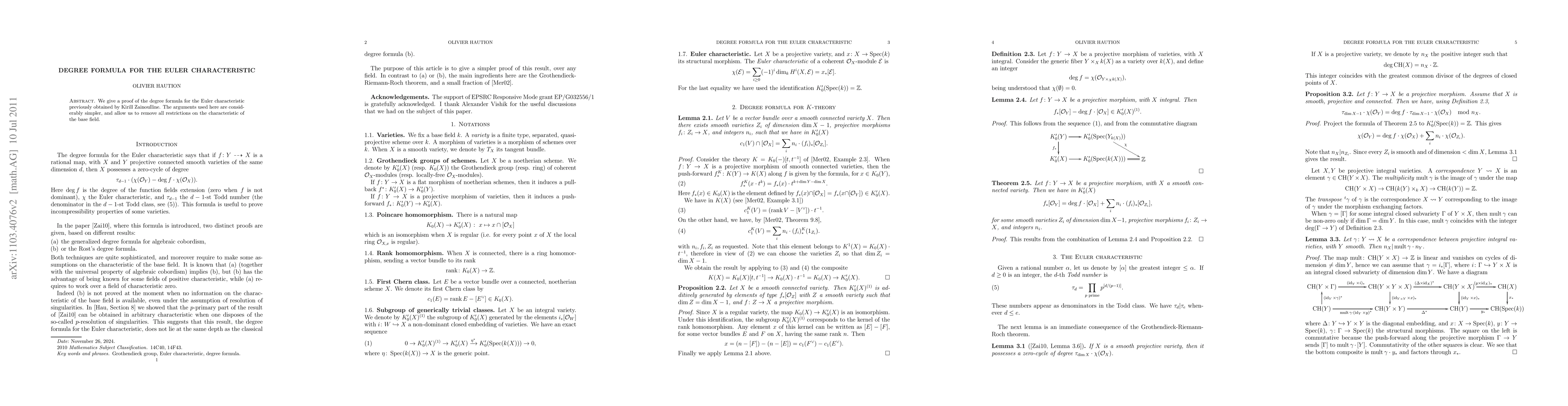 This paper presents a simplified proof of the degree formula for the Euler characteristic, previously established by Zainoulline, without any restrictions on the characteristic of the base field.