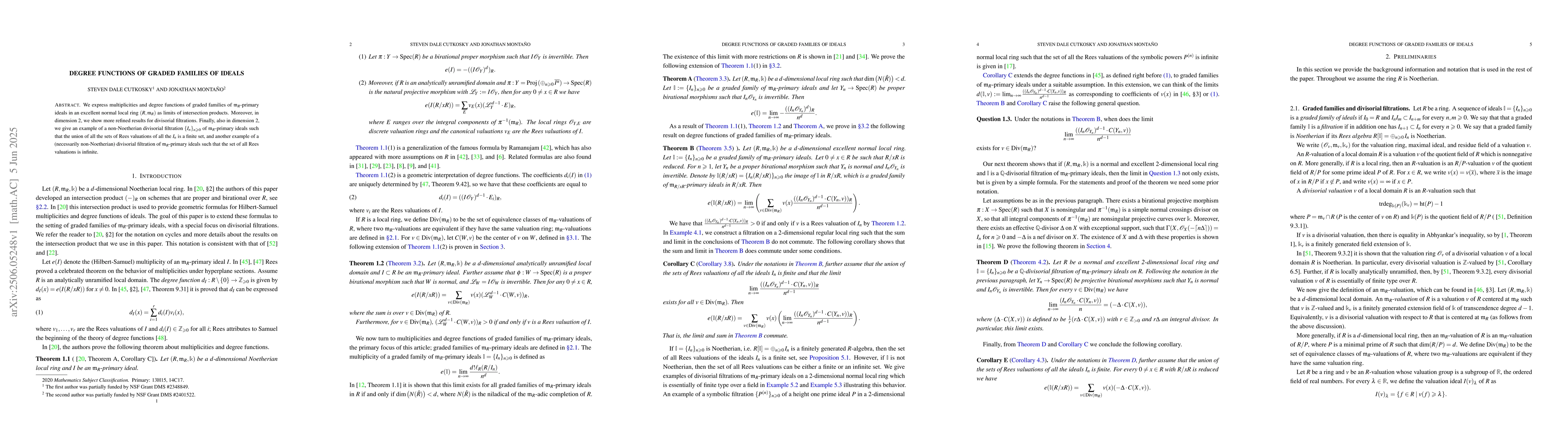 Researchers express multiplicities and degree functions of graded families of ideals as limits of intersection products in excellent normal local rings, highlighting key findings on divisorial filtrations in dimensions 2.