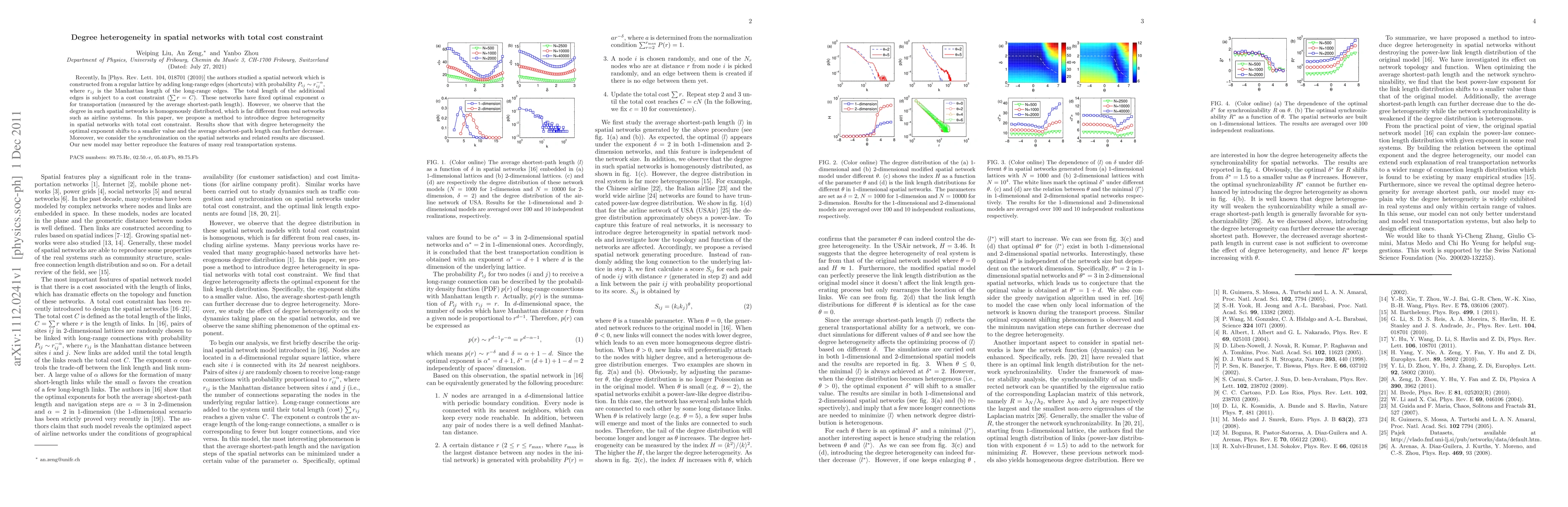 Recently, In [Phys. Rev. Lett. 104, 018701 (2010)] the authors studied a spatial network which is constructed from a regular lattice by adding long-range edges (shortcuts) with probability $P_{ij}\sim r_{ij}^{-\alpha}$, where $r_{ij}$ is the Manhattan length of the long-range edges. The total length of the additional edges is subject to a cost constraint ($\sum r=C$). These networks have fixed optimal exponent $\alpha$ for transportation (measured by the average shortest-path length). However, we observe that the degree in such spatial networks is homogenously distributed, which is far different from real networks such as airline systems. In this paper, we propose a method to introduce degree heterogeneity in spatial networks with total cost constraint. Results show that with degree heterogeneity the optimal exponent shifts to a smaller value and the average shortest-path length can further decrease. Moreover, we consider the synchronization on the spatial networks and related results are discussed. Our new model may better reproduce the features of many real transportation systems.