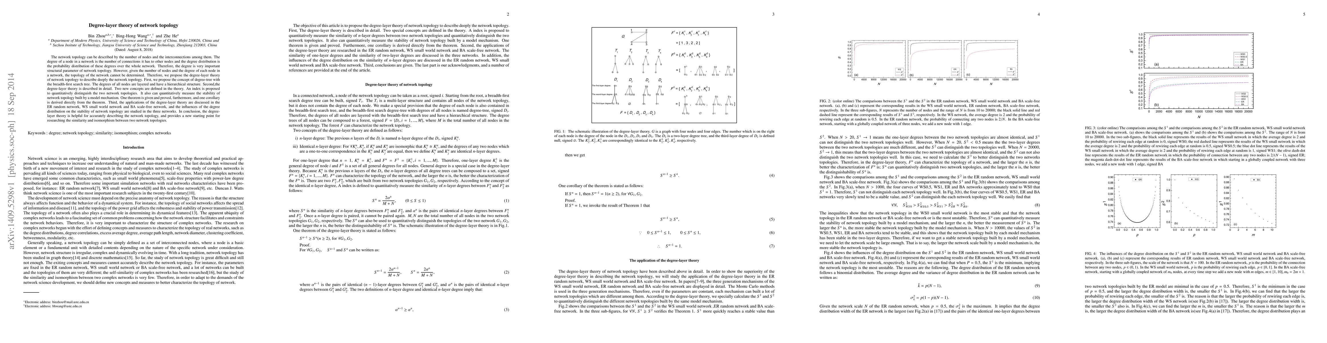 The network topology can be described by the number of nodes and the interconnections among them. The degree of a node in a network is the number of connections it has to other nodes and the degree distribution is the probability distribution of these degrees over the whole network. Therefore, the degree is very important structural parameter of network topology. However, given the number of nodes and the degree of each node in a network, the topology of the network cannot be determined. Therefore, we propose the degree-layer theory of network topology to describe deeply the network topology. First, we propose the concept of degree-tree with the breadth-first search tree. The degrees of all nodes are layered and have a hierarchical structure. Second,the degree-layer theory is described in detail. Two new concepts are defined in the theory. An index is proposed to quantitatively distinguish the two network topologies. It also can quantitatively measure the stability of network topology built by a model mechanism. One theorem is given and proved, furthermore, and one corollary is derived directly from the theorem. Third, the applications of the degree-layer theory are discussed in the ER random network, WS small world network and BA scale-free network, and the influences of the degree distribution on the stability of network topology are studied in the three networks. In conclusion, the degree-layer theory is helpful for accurately describing the network topology, and provides a new starting point for researching the similarity and isomorphism between two network topologies.