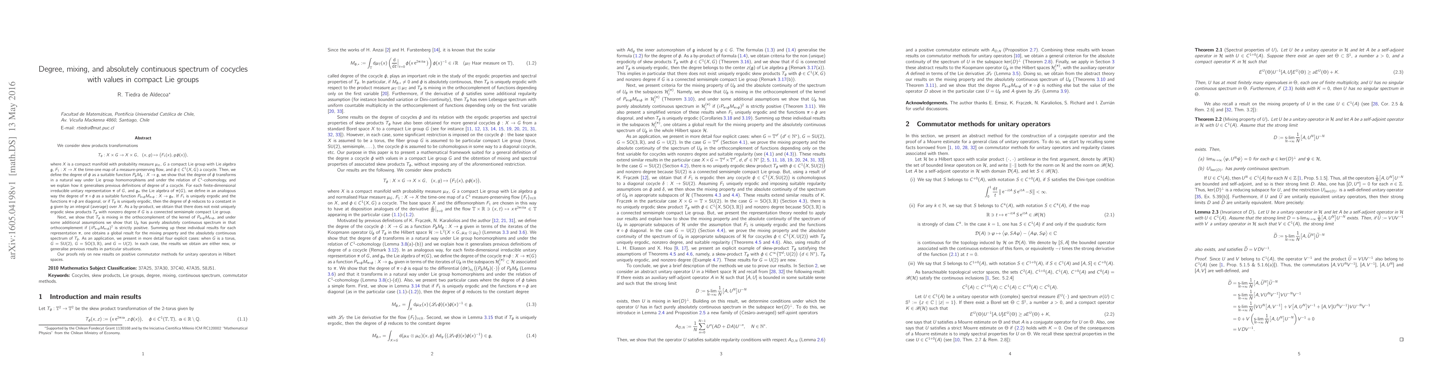 We consider skew products $$T_\phi:X\times G\to X\times G,~~(x,g)\mapsto(F_1(x),g\;\!\phi(x)),$$ where $X$ is a compact manifold with probability measure, $G$ a compact Lie group with Lie algebra $\frak g$, $F_1:X\to X$ the time-one map of a measure-preserving flow, and $\phi\in C^1(X,G)$ a cocycle. Then, we define the degree of $\phi$ as a suitable function $P_\phi M_\phi:X\to\frak g$, we show that it transforms in a natural way under Lie group homomorphisms and under the relation of $C^1$-cohomology, and we explain how it generalises previous definitions of degree of a cocycle. For each finite-dimensional irreducible representation $\pi$ of $G$, and $\frak g_\pi$ the Lie algebra of $\pi(G)$, we define in an analogous way the degree of $\pi\circ\phi$ as a suitable function $P_{\pi\circ\phi}M_{\pi\circ\phi}:X\to\frak g_\pi$. If $F_1$ is uniquely ergodic and the functions $\pi\circ\phi$ diagonal, or if $T_\phi$ is uniquely ergodic, then the degree of $\phi$ reduces to a constant in $\frak g$ given by an integral over $X$. As a by-product, we obtain that there is no uniquely ergodic skew product $T_\phi$ with nonzero degree if $G$ is a connected semisimple compact Lie group. Next, we show that $T_\phi$ is mixing in the orthocomplement of the kernel of $P_{\pi\circ\phi}M_{\pi\circ\phi}$, and under some additional assumptions we show that $U_\phi$ has purely absolutely continuous spectrum in that orthocomplement if $(iP_{\pi\circ\phi}M_{\pi\circ\phi})^2$ is strictly positive. Summing up these results for each $\pi$, one obtains a global result for the mixing and the absolutely continuous spectrum of $T_\phi$. As an application, we present four explicit cases: when $G$ is a torus, $G=SU(2)$, $G=SO(3,\mathbb R)$, and $G=U(2)$. In each case, the results we obtain are new, or generalise previous results. Our proofs rely on new results on positive commutator methods for unitary operators.