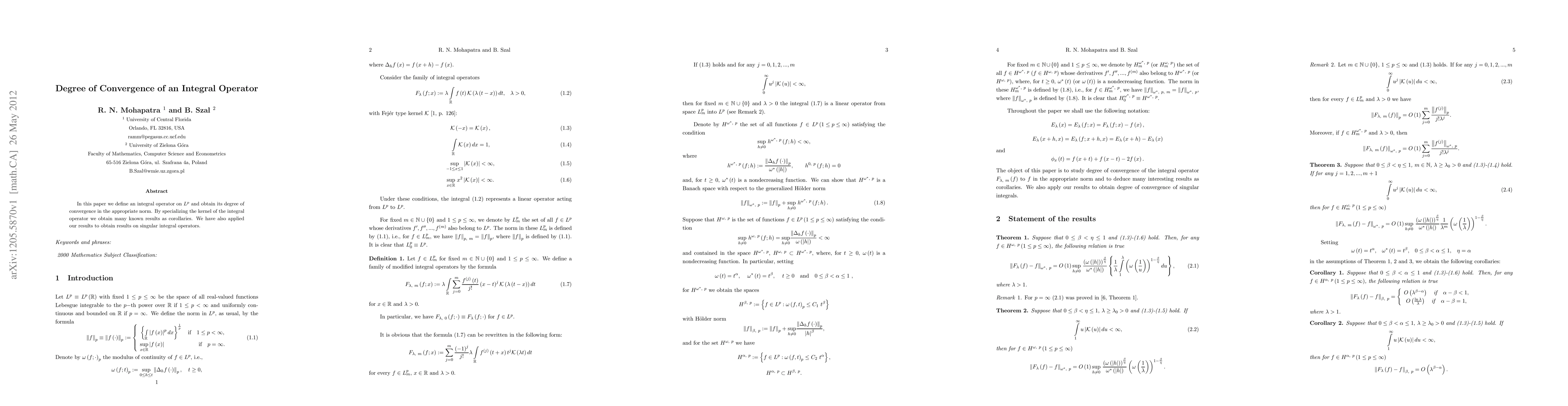 In this paper we define an integral operator on Lp and obtain its degree of convergence in the appropriate norm. By specializing the kernel of the integral operator we obtain many known results as corollaries. We have also applied our results to obtain results on singular integral operators.