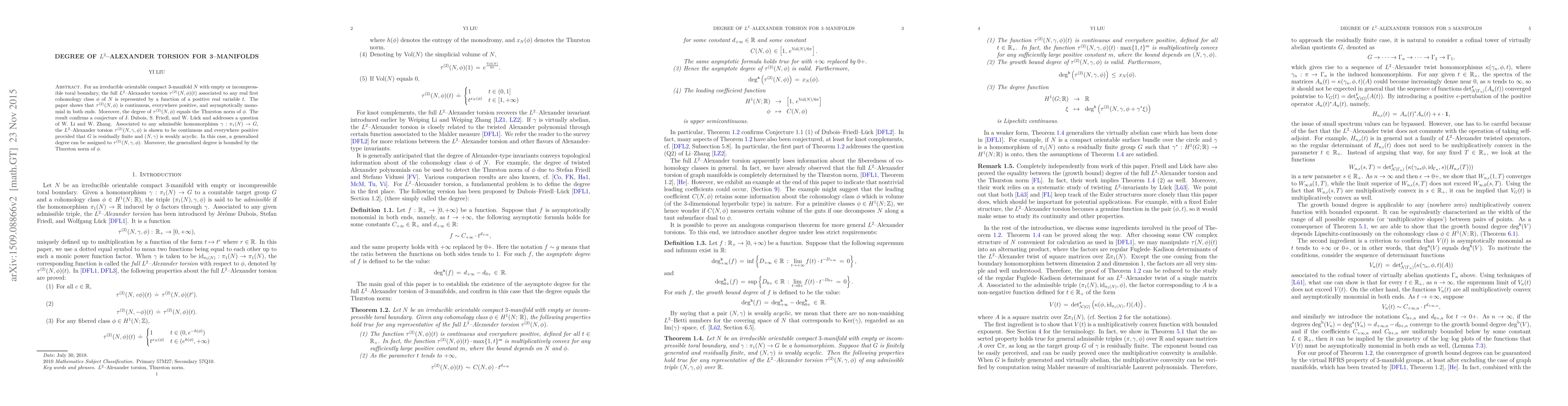 For an irreducible orientable compact $3$-manifold $N$ with empty or incompressible toral boundary, the full $L^2$--Alexander torsion $\tau^{(2)}(N,\phi)(t)$ associated to any real first cohomology class $\phi$ of $N$ is represented by a function of a positive real variable $t$. The paper shows that $\tau^{(2)}(N,\phi)$ is continuous, everywhere positive, and asymptotically monomial in both ends. Moreover, the degree of $\tau^{(2)}(N,\phi)$ equals the Thurston norm of $\phi$. The result confirms a conjecture of J.~Dubois, S.~Friedl, and W.~L\"uck and addresses a question of W.~Li and W.~Zhang. Associated to any admissible homomorphism $\gamma:\pi_1(N)\to G$, the $L^2$--Alexander torsion $\tau^{(2)}(N,\gamma,\phi)$ is shown to be continuous and everywhere positive provided that $G$ is residually finite and $(N,\gamma)$ is weakly acyclic. In this case, a generalized degree can be assigned to $\tau^{(2)}(N,\gamma,\phi)$. Moreover, the generalized degree is bounded by the Thurston norm of $\phi$.