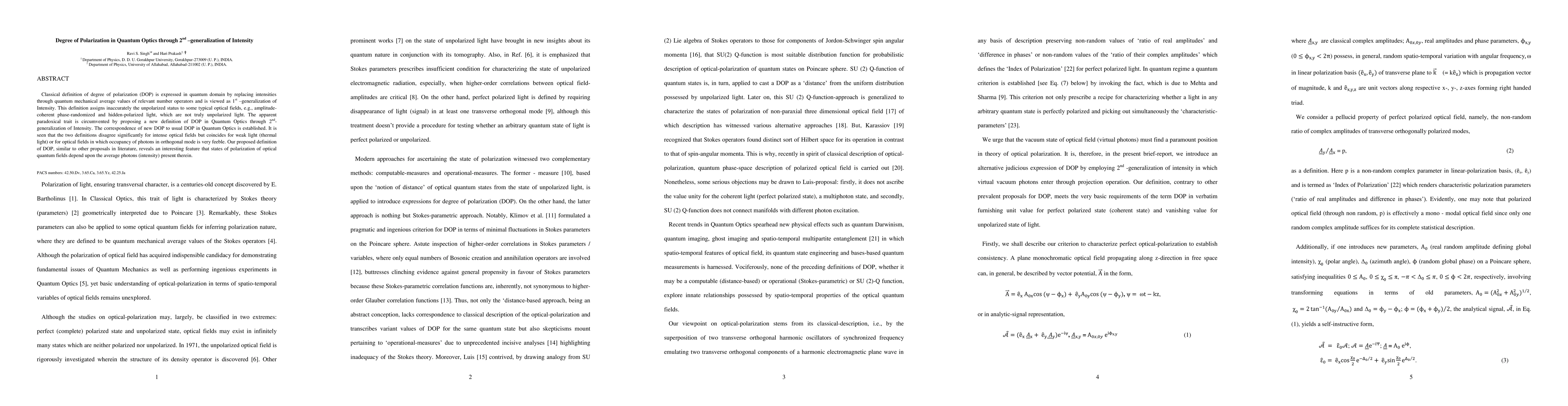 Classical definition of degree of polarization is expressed in quantum domain by replacing intensities through quantum mechanical average values of relevant number operators and is viewed as first generalization of Intensity. This definition assigns inaccurately the unpolarized status to some typical optical fields such as amplitude coherent phase randomized and hidden polarized, which are not truly unpolarized light. The apparent paradoxical trait is circumvented by proposing a new definition of degree of polarization in Quantum Optics through second generalization of Intensity. The correspondence of new degree of polarization to usual degree of polarization in Quantum Optics is established. It is seen that the two definitions disagree significantly for intense optical fields but coincides for weak light (thermal light) or for optical fields in which occupancy of photons in orthogonal mode is very feeble. Our proposed definition of degree of polarization, similar to other proposals in literature, reveals an interesting feature that states of polarization of optical quantum fields depend upon the average photons (intensity) present therein.