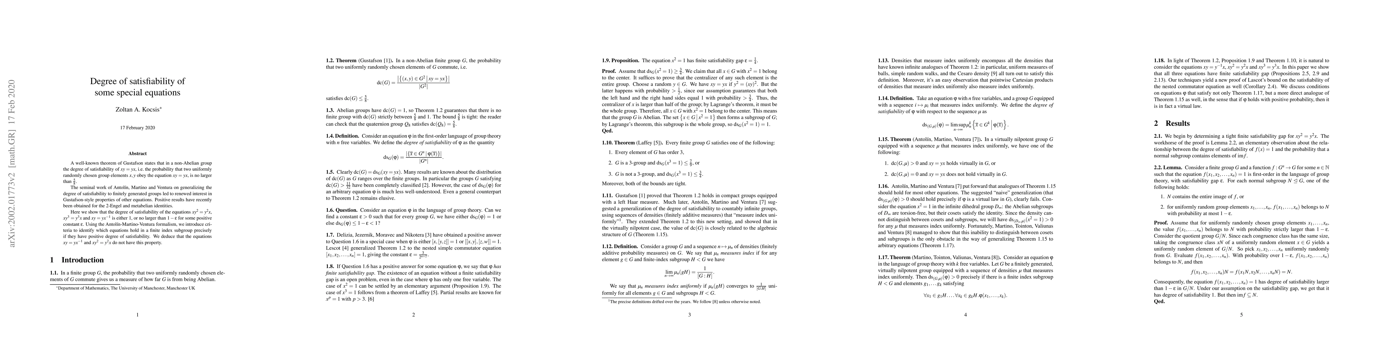A well-known theorem of Gustafson states that in a non-Abelian group the degree of satisfiability of $xy=yx$, i.e. the probability that two uniformly randomly chosen group elements $x,y$ obey the equation $xy=yx$, is no larger than $\frac{5}{8}$. The seminal work of Antolin, Martino and Ventura (arXiv:1511.07269) on generalizing the degree of satisfiability to finitely generated groups led to renewed interest in Gustafson-style properties of other equations. Positive results have recently been obtained for the 2-Engel and metabelian identities (arXiv:1809.02997). Here we show that the degree of satisfiability of the equations $xy^2=y^2x$, $xy^3=y^3x$ and $xy=yx^{-1}$ is either 1, or no larger than $1-\varepsilon$ for some positive constant $\varepsilon$. Using the Antolin-Martino-Ventura formalism, we introduce criteria to identify which equations hold in a finite index subgroup precisely if they have positive degree of satisfiability. We deduce that the equations $xy=yx^{-1}$ and $xy^2=y^2x$ do not have this property.