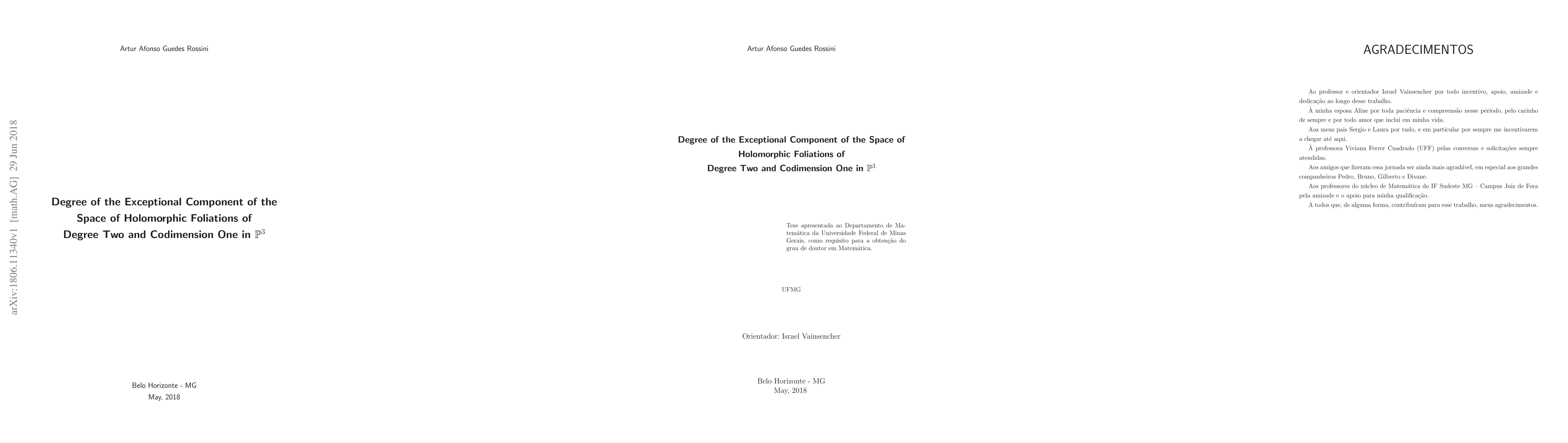 The purpose of this thesis is to obtain the degree of the exceptional component of the space of holomorphic foliations of degree two and codimension one in P3. I construct a parameter space as an explicit fiber bundle over the variety of complete flags. Using tools from equivariant intersection theory, especially Bott's formula, the degree is expressed as an integral over our parameter space.