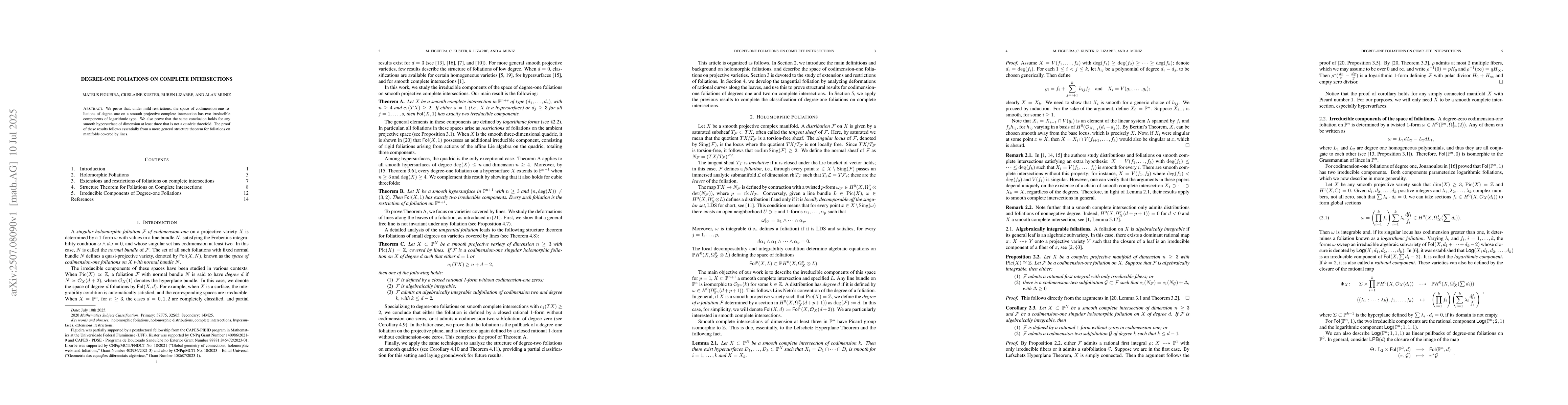 We prove that, under mild restrictions, the space of codimension-one foliations of degree one on a smooth projective complete intersection has two irreducible components of logarithmic type. We also prove that the same conclusion holds for any smooth hypersurface of dimension at least three that is not a quadric threefold. The proof of these results follows essentially from a more general structure theorem for foliations on manifolds covered by lines.