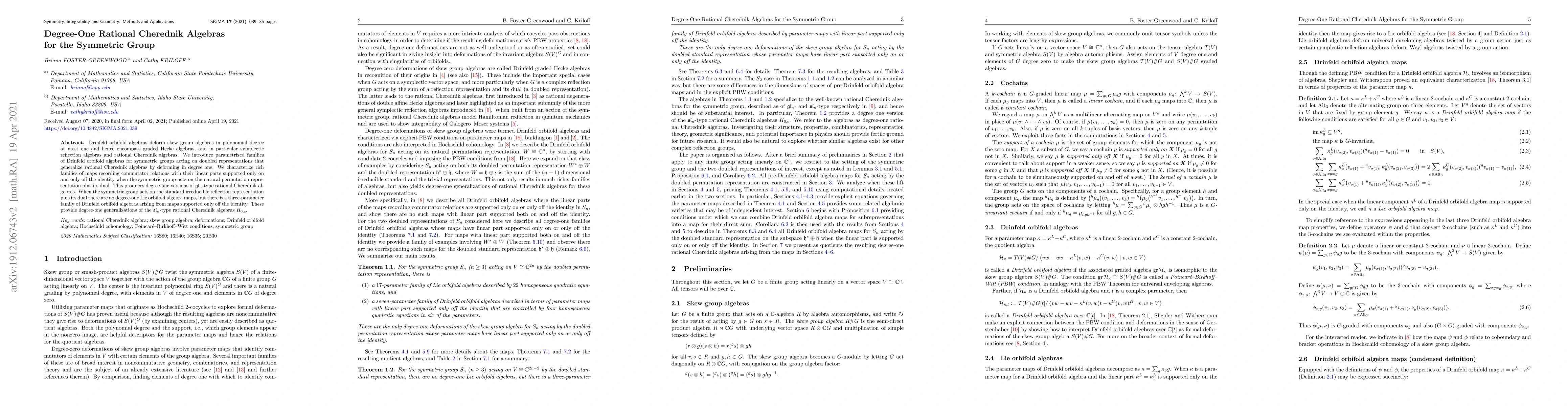 Drinfeld orbifold algebras deform skew group algebras in polynomial degree at most one and hence encompass graded Hecke algebras, and in particular symplectic reflection algebras and rational Cherednik algebras. We introduce parametrized families of Drinfeld orbifold algebras for symmetric groups acting on doubled representations that generalize rational Cherednik algebras by deforming in degree one. We characterize rich families of maps recording commutator relations with their linear parts supported only on and only off the identity when the symmetric group acts on the natural permutation representation plus its dual. This produces degree-one versions of $\mathfrak{gl}_n$-type rational Cherednik algebras. When the symmetric group acts on the standard irreducible reflection representation plus its dual there are no degree-one Lie orbifold algebra maps, but there is a three-parameter family of Drinfeld orbifold algebras arising from maps supported only off the identity. These provide degree-one generalizations of the $\mathfrak{sl}_n$-type rational Cherednik algebras $H_{0,c}$.