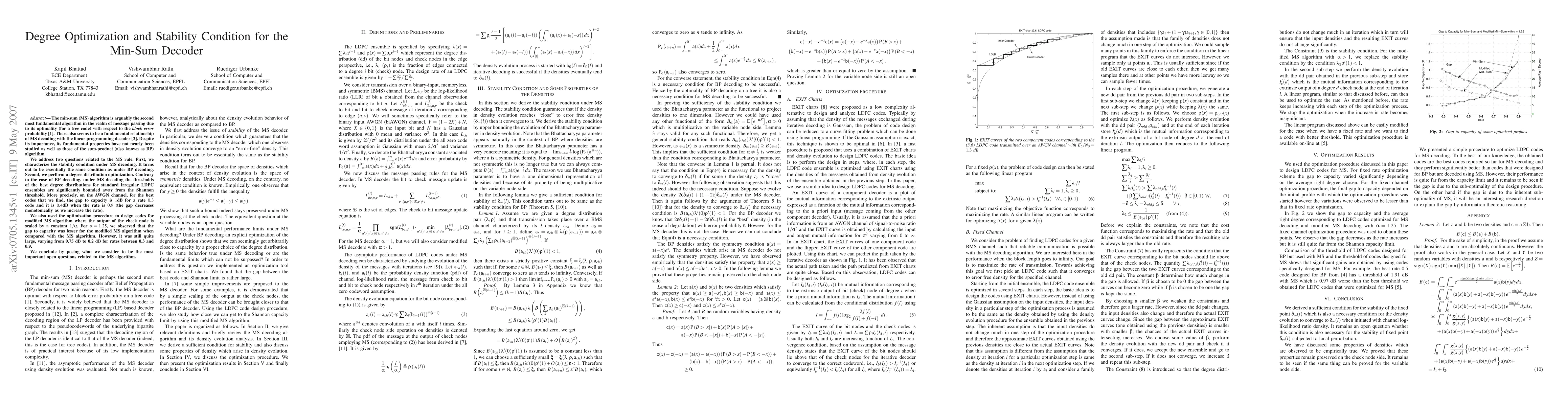 The min-sum (MS) algorithm is arguably the second most fundamental algorithm in the realm of message passing due to its optimality (for a tree code) with respect to the {\em block error} probability \cite{Wiberg}. There also seems to be a fundamental relationship of MS decoding with the linear programming decoder \cite{Koetter}. Despite its importance, its fundamental properties have not nearly been studied as well as those of the sum-product (also known as BP) algorithm. We address two questions related to the MS rule. First, we characterize the stability condition under MS decoding. It turns out to be essentially the same condition as under BP decoding. Second, we perform a degree distribution optimization. Contrary to the case of BP decoding, under MS decoding the thresholds of the best degree distributions for standard irregular LDPC ensembles are significantly bounded away from the Shannon threshold. More precisely, on the AWGN channel, for the best codes that we find, the gap to capacity is 1dB for a rate 0.3 code and it is 0.4dB when the rate is 0.9 (the gap decreases monotonically as we increase the rate). We also used the optimization procedure to design codes for modified MS algorithm where the output of the check node is scaled by a constant $1/\alpha$. For $\alpha = 1.25$, we observed that the gap to capacity was lesser for the modified MS algorithm when compared with the MS algorithm. However, it was still quite large, varying from 0.75 dB to 0.2 dB for rates between 0.3 and 0.9. We conclude by posing what we consider to be the most important open questions related to the MS algorithm.