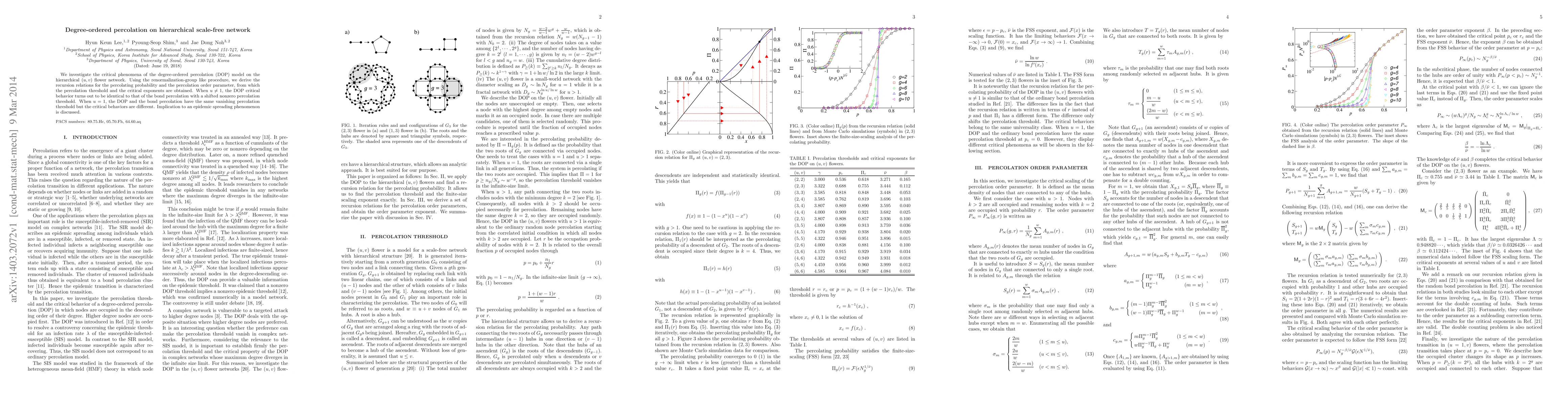 This paper studies the critical behavior of degree-ordered percolation on hierarchical $(u,v)$ flower networks, deriving recursion relations for percolation probability and order parameter. It finds that DOP behavior mirrors bond percolation when $u\neq 1$ but differs when $u=1$, with implications for epidemic spreading models.
