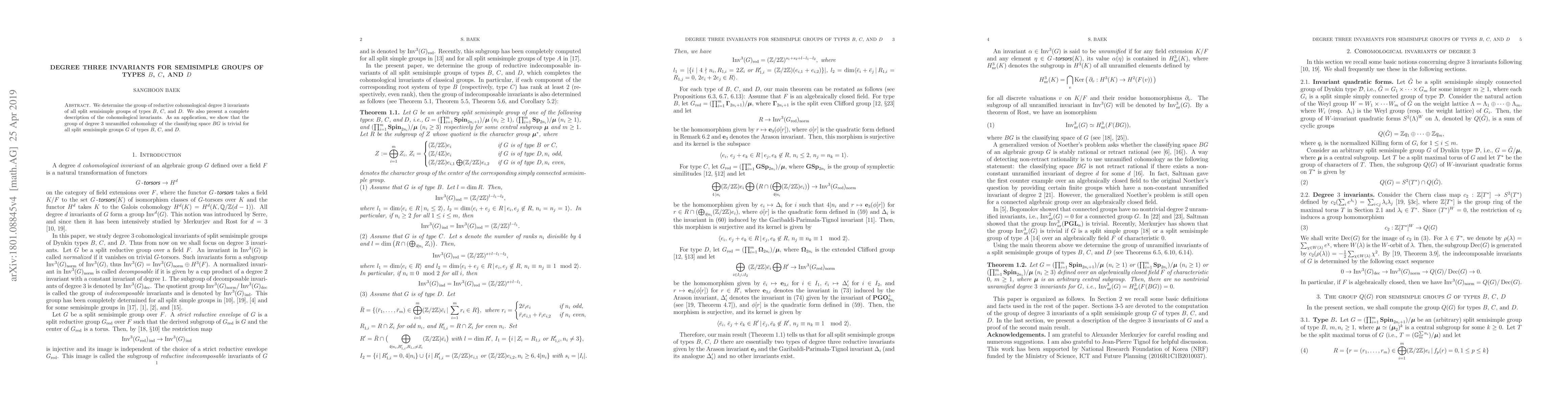 This paper determines the group of degree three reductive cohomological invariants for semisimple groups of types $B$, $C$, and $D$, providing a complete description of the cohomological invariants and proving that the group of degree three unramified cohomology of the classifying space $BG$ is trivial for these groups.
