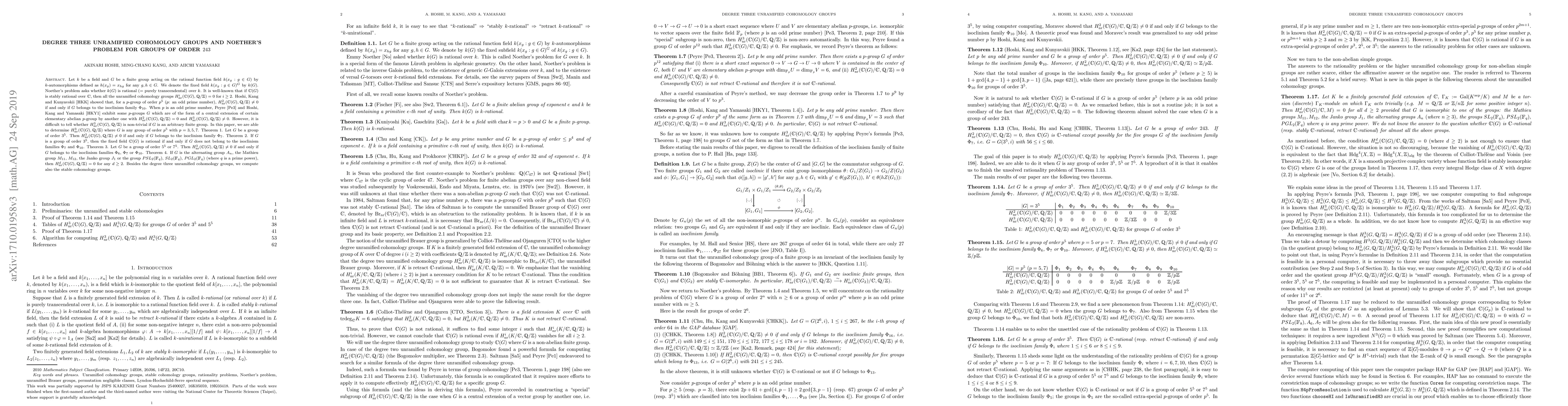 Let $k$ be a field and $G$ be a finite group acting on the rational function field $k(x_g : g\in G)$ by $k$-automorphisms defined as $h(x_g)=x_{hg}$ for any $g,h\in G$. We denote the fixed field $k(x_g : g\in G)^G$ by $k(G)$. Noether's problem asks whether $k(G)$ is rational (= purely transcendental) over $k$. It is well-known that if $C(G)$ is stably rational over $C$, then all the unramified cohomology groups $H_[nr}^i(C(G),Q/Z)=0$ for $i \ge 2$. Hoshi, Kang and Kunyavskii [HKK] showed that, for a $p$-group of order $p^5$ ($p$: an odd prime number), $H_[nr}^2(C(G),Q/Z)\neq 0$ if and only if $G$ belongs to the isoclinism family $\Phi_{10}$. When $p$ is an odd prime number, Peyre [Pe3] and Hoshi, Kang and Yamasaki [HKY1] exhibit some $p$-groups $G$ which are of the form of a central extension of certain elementary abelian $p$-group by another one with $H_[nr}^2(C(G),Q/Z)=0$ and $H_[nr}^3(C(G),Q/Z)\neq 0$. However, it is difficult to tell whether $H_[nr}^3(C(G),Q/Z)$ is non-trivial if $G$ is an arbitrary finite group. In this paper, we are able to determine $H_[nr}^3(C(G),Q/Z)$ where $G$ is any group of order $p^5$ with $p=3, 5, 7$. Theorem 1. Let $G$ be a group of order $3^5$. Then $H_[nr}^3(C(G),Q/Z)\neq 0$ if and only if $G$ belongs to $\Phi_7$. Theorem 2. If $G$ is a group of order $3^5$, then the fixed field $C(G)$ is rational if and only if $G$ does not belong to $\Phi_{7}$ and $\Phi_{10}$. Theorem 3. Let $G$ be a group of order $5^5$ or $7^5$. Then $H_[nr}^3(C(G),Q/Z)\neq 0$ if and only if $G$ belongs to $\Phi_6$, $\Phi_7$ or $\Phi_{10}$. Theorem 4. If $G$ is the alternating group $A_n$, the Mathieu group $M_{11}$, $M_{12}$, the Janko group $J_1$ or the group $PSL_2(F_q)$, $SL_2(F_q)$, $PGL_2(F_q)$ (where $q$ is a prime power), then $H_[nr}^d(C(G),Q/Z)=0$ for any $d\ge 2$. Besides the degree three unramified cohomology groups, we compute also the stable cohomology groups.