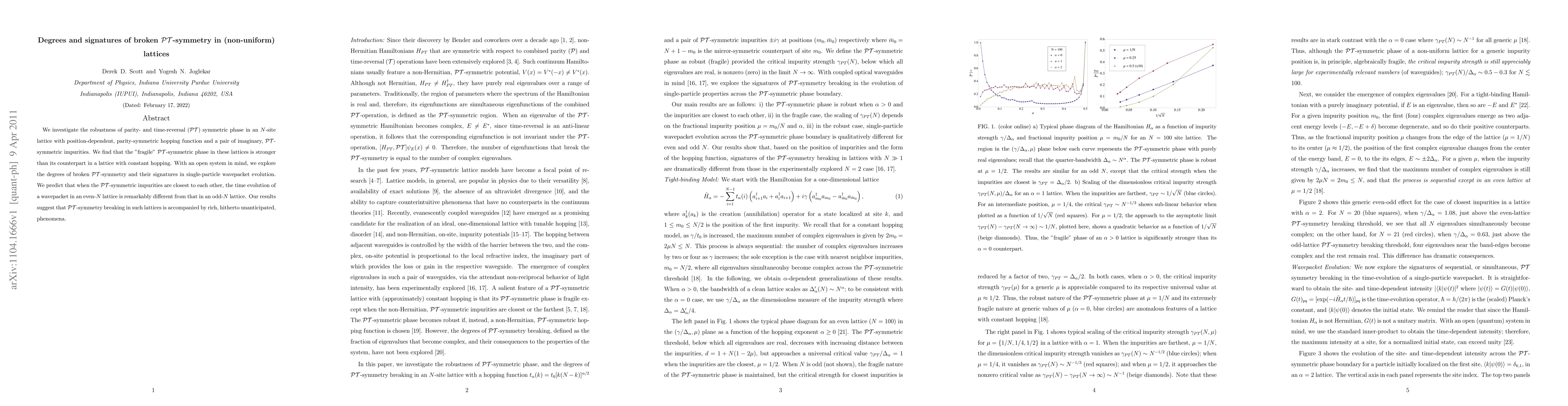 This paper examines the robustness of $\mP\mT$-symmetric phases in non-uniform lattices with position-dependent hopping and $\mP\mT$-symmetric impurities, revealing stronger effects compared to uniform lattices. It also explores the signatures of broken $\mP\mT$-symmetry in wavepacket evolution, predicting distinct time evolution patterns in even- versus odd-$N$ lattices.