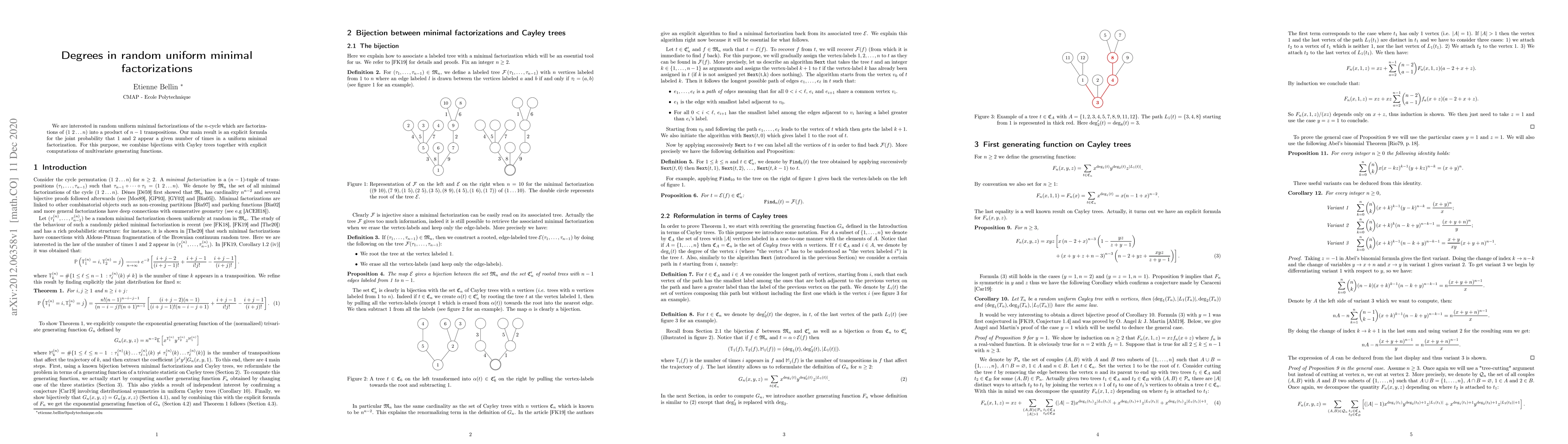 We are interested in random uniform minimal factorizations of the $n$-cycle which are factorizations of $(1~2\dots n)$ into a product of $n-1$ transpositions. Our main result is an explicit formula for the joint probability that 1 and 2 appear a given number of times in a uniform minimal factorization. For this purpose, we combine bijections with Cayley trees together with explicit computations of multivariate generating functions.