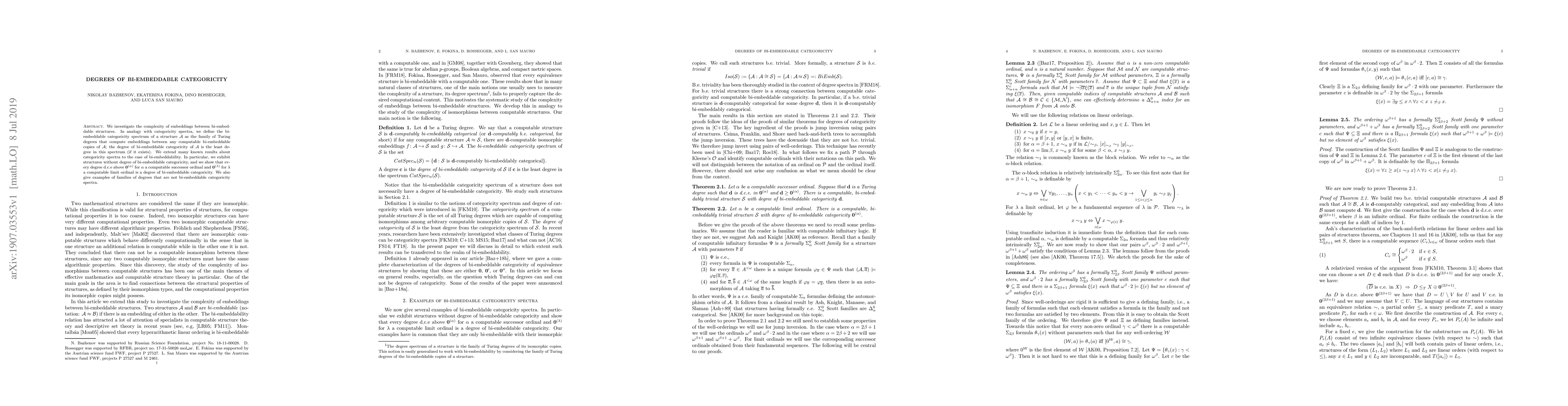 This paper explores the complexity of embeddings between bi-embeddable structures, defining the bi-embeddable categoricity spectrum and degree, and extending known categoricity results. It demonstrates structures without such degrees and shows certain d.c.e. degrees are bi-embeddable categoricity degrees.