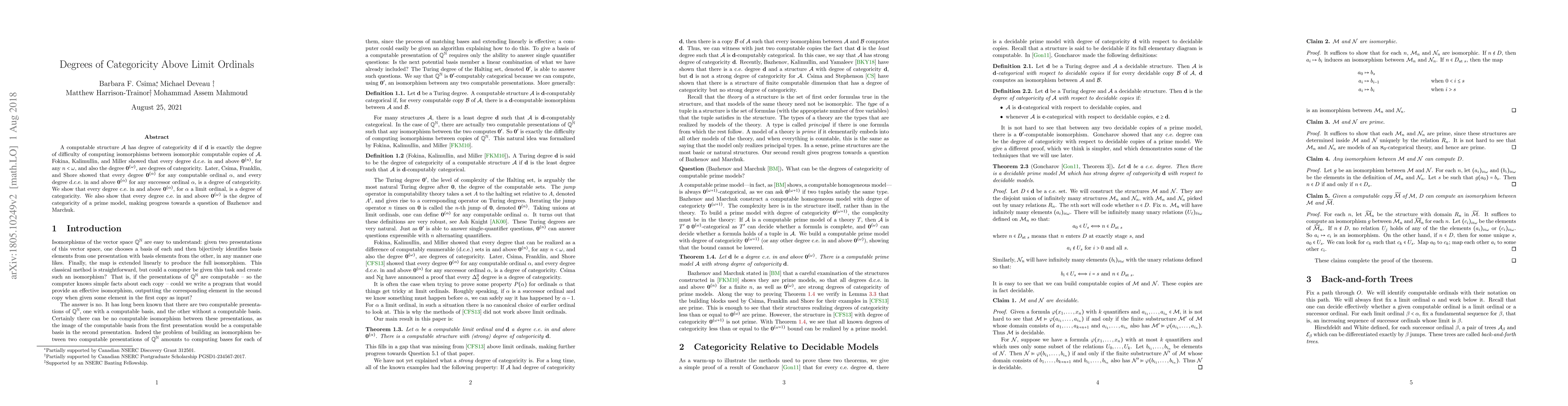 This paper demonstrates that every computably enumerable (c.e.) degree above $\mathbf{0}^{(\alpha)}$ for any limit ordinal $\alpha$ is a degree of categoricity. Additionally, it shows that every c.e. degree above $\mathbf{0}^{(\omega)}$ corresponds to the degree of categoricity of a prime model.