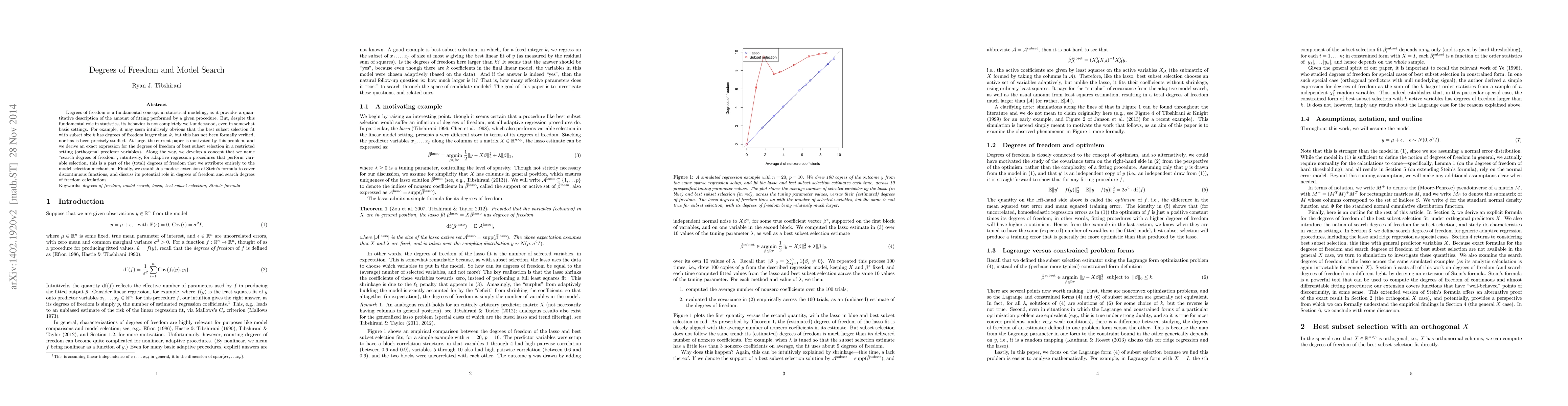 This paper explores the concept of degrees of freedom in statistical modeling, particularly in best subset selection, and introduces "search degrees of freedom" for adaptive regression procedures. It provides an exact expression for the degrees of freedom in the context of orthogonal predictor variables and extends Stein's formula for discontinuous functions.