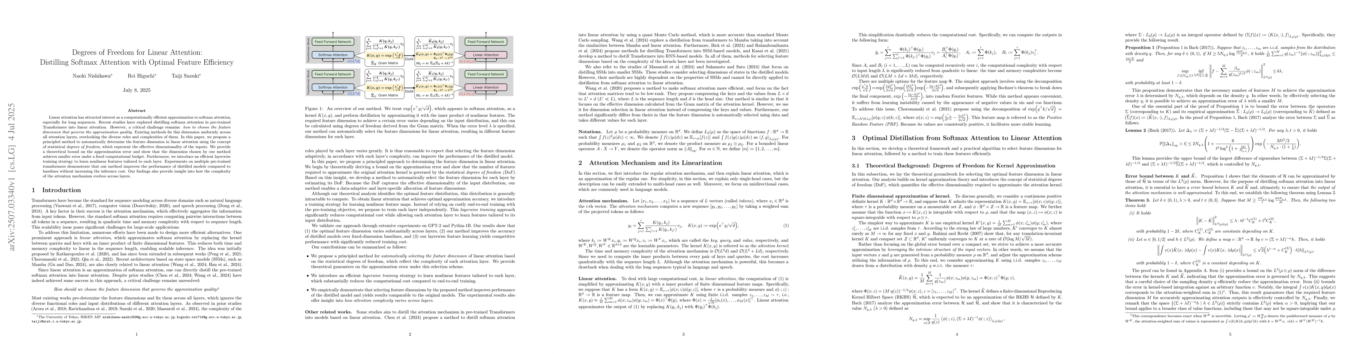 Linear attention has attracted interest as a computationally efficient approximation to softmax attention, especially for long sequences. Recent studies have explored distilling softmax attention in pre-trained Transformers into linear attention. However, a critical challenge remains: how to choose the feature dimension that governs the approximation quality. Existing methods fix this dimension uniformly across all attention layers, overlooking the diverse roles and complexities of them. In this paper, we propose a principled method to automatically determine the feature dimension in linear attention using the concept of statistical degrees of freedom, which represent the effective dimensionality of the inputs. We provide a theoretical bound on the approximation error and show that the dimension chosen by our method achieves smaller error under a fixed computational budget. Furthermore, we introduce an efficient layerwise training strategy to learn nonlinear features tailored to each layer. Experiments on multiple pre-trained transformers demonstrate that our method improves the performance of distilled models compared to baselines without increasing the inference cost. Our findings also provide insight into how the complexity of the attention mechanism evolves across layers.