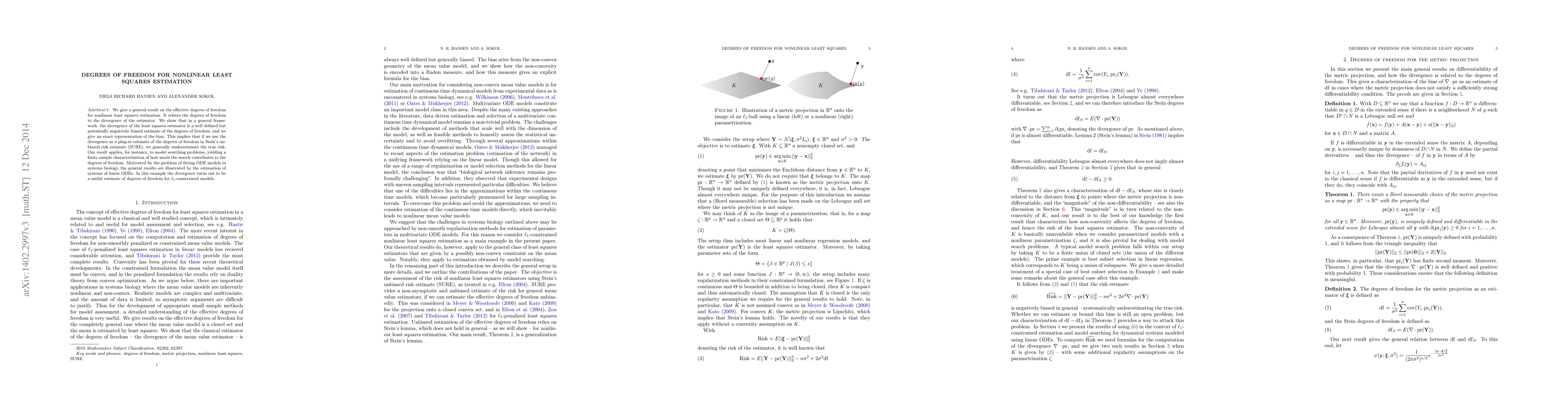 This paper presents a general framework for determining the effective degrees of freedom in nonlinear least squares estimation, showing that the divergence of the estimator can be negatively biased. It illustrates the implications for Stein's unbiased risk estimate (SURE) and applies the results to model searching problems, particularly in fitting systems of linear ODEs in systems biology.