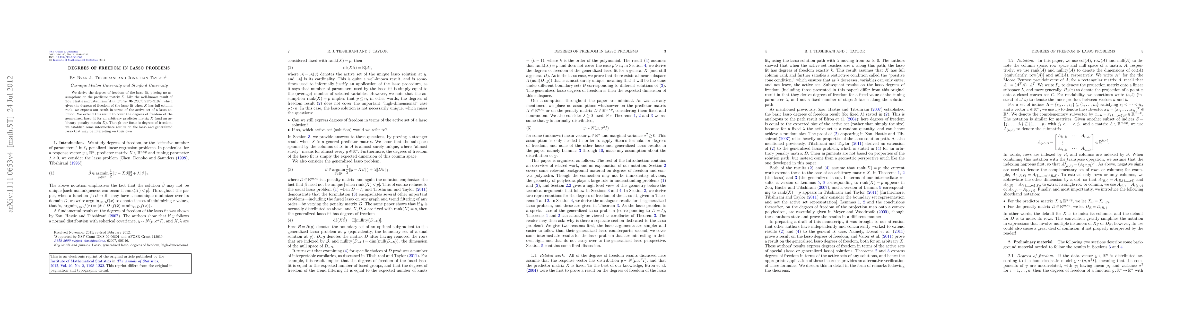 This paper derives the degrees of freedom for the lasso fit without assuming the predictor matrix $X$ has full column rank, extending existing results to arbitrary $X$ and penalty matrices $D$. It also provides intermediate results on the lasso and generalized lasso that may be of independent interest.