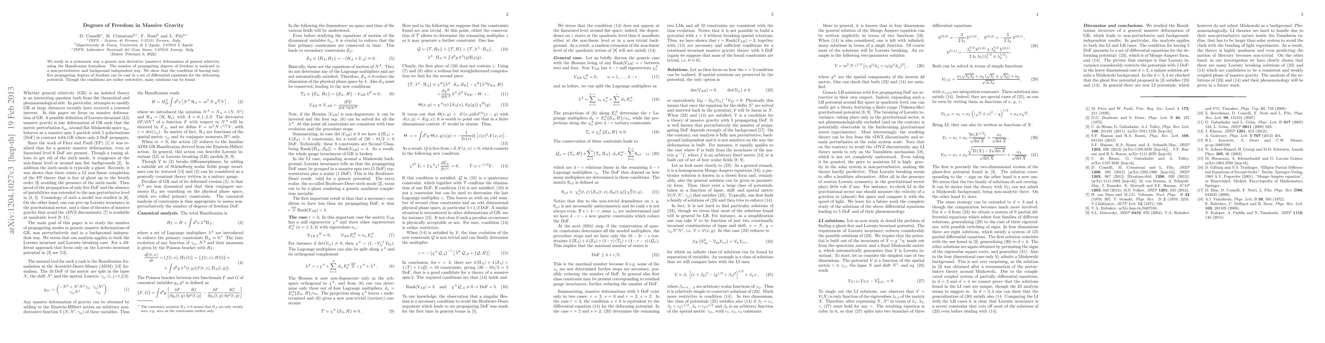 This research systematically explores a massive deformation of general relativity via the Hamiltonian formalism, finding that five propagating degrees of freedom can be maintained through specific differential equations for the deforming potential, despite the restrictive conditions allowing numerous viable solutions.