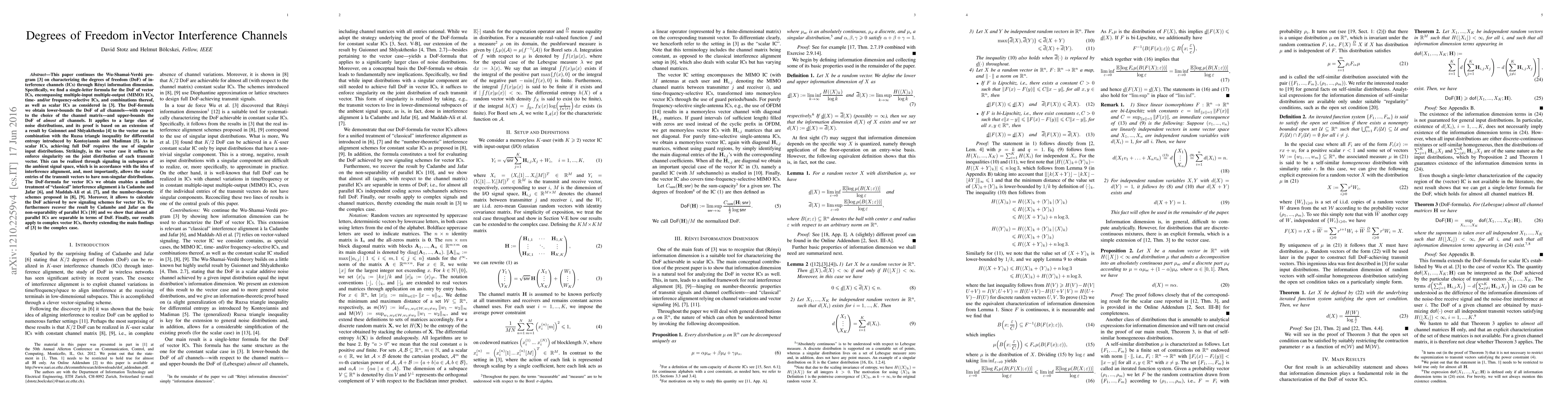 This paper continues the Wu-Shamai-Verdu program [3] on characterizing the degrees of freedom (DoF) of interference channels (ICs) through Renyi information dimension. Specifically, we find a single-letter formula for the DoF of vector ICs, encompassing multiple-input multiple-output (MIMO) ICs, time- and/or frequency-selective ICs, and combinations thereof, as well as scalar ICs as considered in [3]. The DoF-formula we obtain lower-bounds the DoF of all channels--with respect to the choice of the channel matrix--and upper-bounds the DoF of almost all channels. It applies to a large class of noise distributions, and its proof is based on an extension of a result by Guionnet and Shlyakthenko [3] to the vector case in combination with the Ruzsa triangle inequality for differential entropy introduced by Kontoyiannis and Madiman [4]. As in scalar ICs, achieving full DoF requires the use of singular input distributions. Strikingly, in the vector case it suffices to enforce singularity on the joint distribution of each individual transmit vector. This can be realized through signaling in subspaces of the ambient signal space, which is in accordance with the idea of interference alignment, and, most importantly, allows the scalar entries of the transmit vectors to have non-singular distributions. The DoF-formula for vector ICs we obtain enables a unified treatment of "classical" interference alignment a la Cadambe and Jafar [5], and Maddah-Ali et al. [6], and the number-theoretic schemes proposed in [7], [8]. Moreover, it allows to calculate the DoF achieved by new signaling schemes for vector ICs. We furthermore recover the result by Cadambe and Jafar on the non-separability of parallel ICs [9] and we show that almost all parallel ICs are separable in terms of DoF. Finally, our results apply to complex vector ICs, thereby extending the main findings of [2] to the complex case.