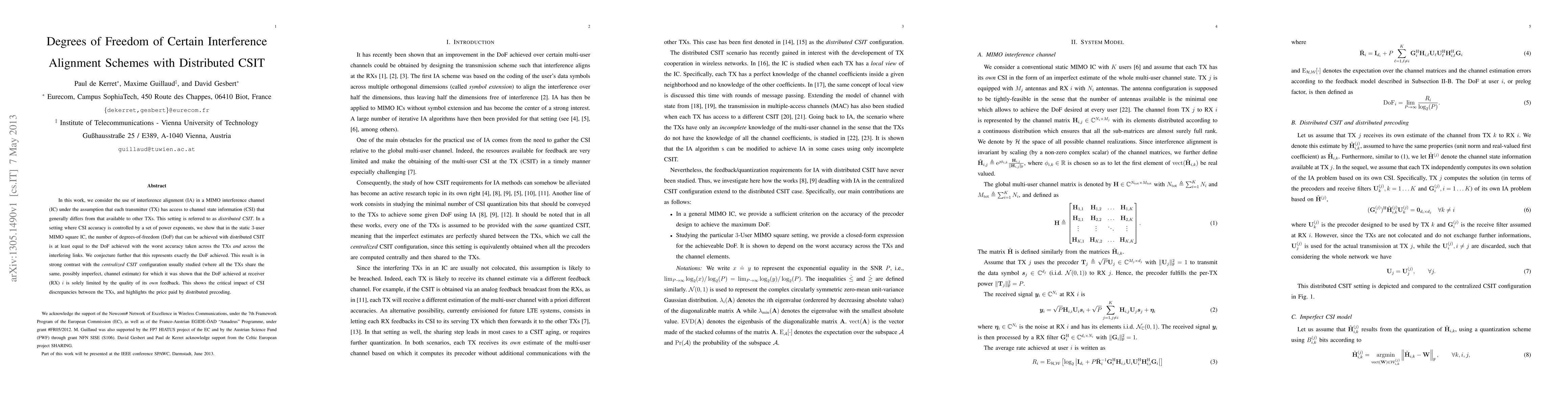 Researchers studied how interference alignment schemes perform in a multi-user MIMO channel with distributed Channel State Information (CSI). They found that the achieved degrees of freedom can be at least as good as the worst-case scenario across all users and links.