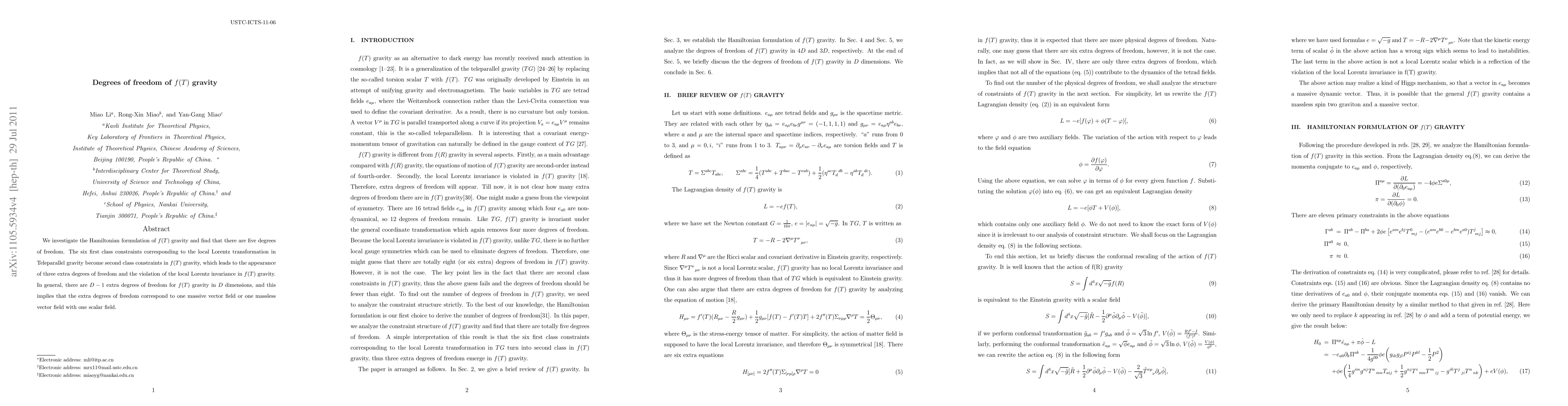We investigate the Hamiltonian formulation of $f(T)$ gravity and find that there are five degrees of freedom. The six first class constraints corresponding to the local Lorentz transformation in Teleparallel gravity become second class constraints in $f(T)$ gravity, which leads to the appearance of three extra degrees of freedom and the violation of the local Lorentz invariance in $f(T)$ gravity. In general, there are $D-1$ extra degrees of freedom for $f(T)$ gravity in $D$ dimensions, and this implies that the extra degrees of freedom correspond to one massive vector field or one massless vector field with one scalar field.