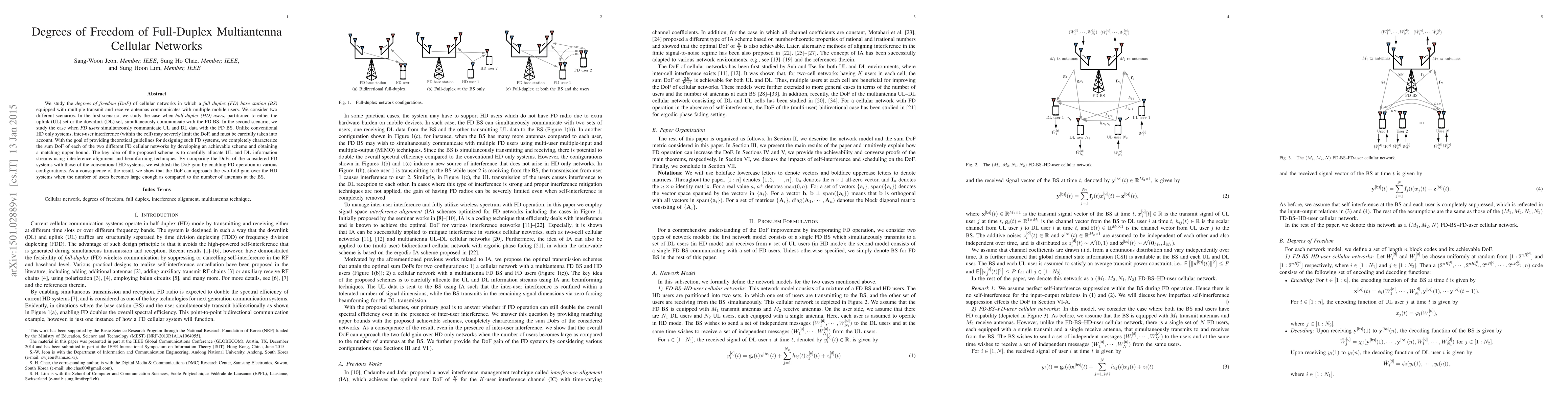 We study the degrees of freedom (DoF) of cellular networks in which a full duplex (FD) base station (BS) equipped with multiple transmit and receive antennas communicates with multiple mobile users. We consider two different scenarios. In the first scenario, we study the case when half duplex (HD) users, partitioned to either the uplink (UL) set or the downlink (DL) set, simultaneously communicate with the FD BS. In the second scenario, we study the case when FD users simultaneously communicate UL and DL data with the FD BS. Unlike conventional HD only systems, inter-user interference (within the cell) may severely limit the DoF, and must be carefully taken into account. With the goal of providing theoretical guidelines for designing such FD systems, we completely characterize the sum DoF of each of the two different FD cellular networks by developing an achievable scheme and obtaining a matching upper bound. The key idea of the proposed scheme is to carefully allocate UL and DL information streams using interference alignment and beamforming techniques. By comparing the DoFs of the considered FD systems with those of the conventional HD systems, we establish the DoF gain by enabling FD operation in various configurations. As a consequence of the result, we show that the DoF can approach the two-fold gain over the HD systems when the number of users becomes large enough as compared to the number of antennas at the BS.