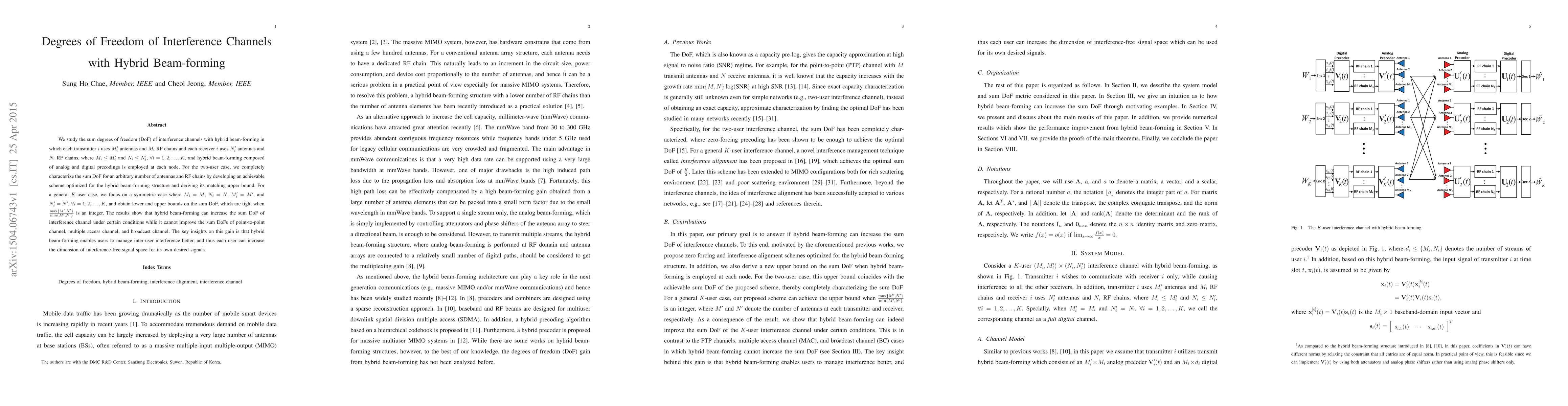 We study the sum degrees of freedom (DoF) of interference channels with hybrid beam-forming in which hybrid beam-forming composed of analog and digital precodings is employed at each node. For the two-user case, we completely characterize the sum DoF for an arbitrary number of antennas and RF chains by developing an achievable scheme optimized for the hybrid beam-forming structure and deriving its matching upper bound. For a general K-user case, we focus on a symmetric case and obtain lower and upper bounds on the sum DoF, which are tight for certain cases. The results show that hybrid beam-forming can increase the sum DoF of interference channel under certain conditions while it cannot improve the sum DoFs of point-to-point channel, multiple access channel, and broadcast channel. The key insights on this gain is that hybrid beam-forming enables users to manage inter user interference better, and thus each user can increase the dimension of interference-free signal space for its own desired signals.