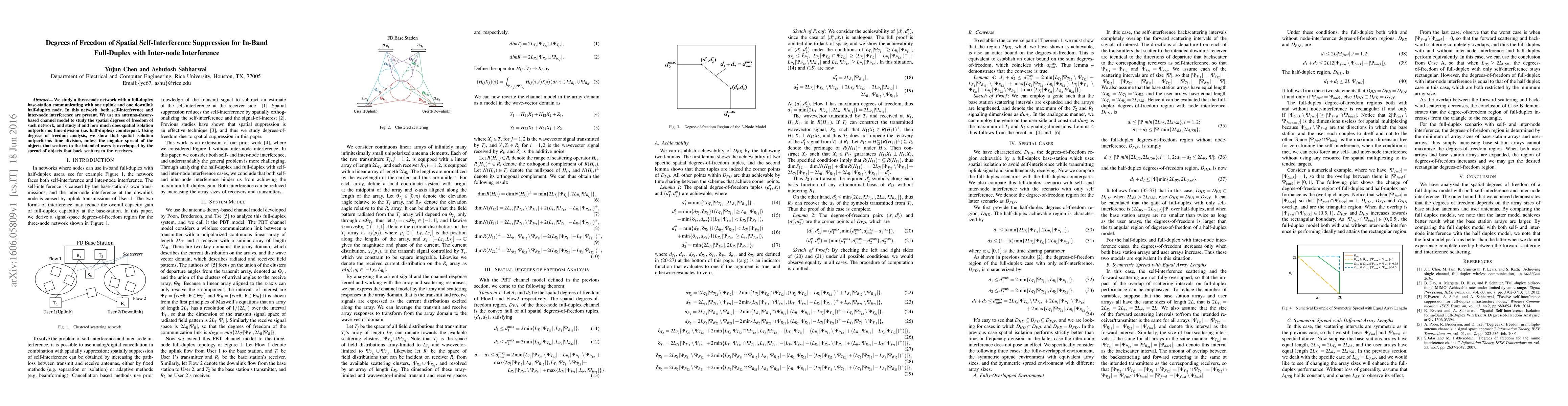 This paper investigates a three-node network with a full-duplex base-station and half-duplex uplink/downlink nodes, focusing on spatial self-interference and inter-node interference. It demonstrates that spatial isolation can outperform time-division methods, except when scattering objects overlap between intended users and receivers.