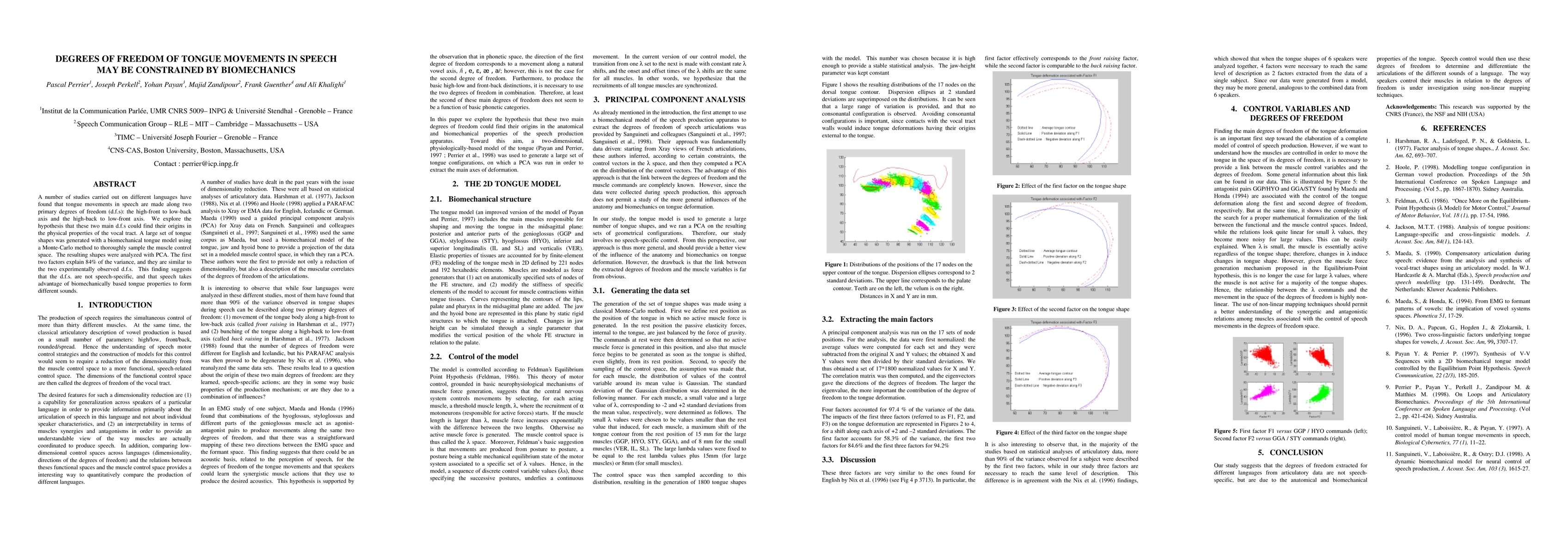 This study uses a biomechanical tongue model to demonstrate that primary tongue movements in speech, previously observed across various languages, align with the physical properties of the vocal tract. Through Monte-Carlo sampling and Principal Component Analysis, the research shows that the first two factors explain 84% of variance, mirroring the two observed degrees of freedom, suggesting these are inherent to tongue biomechanics rather than speech-specific.