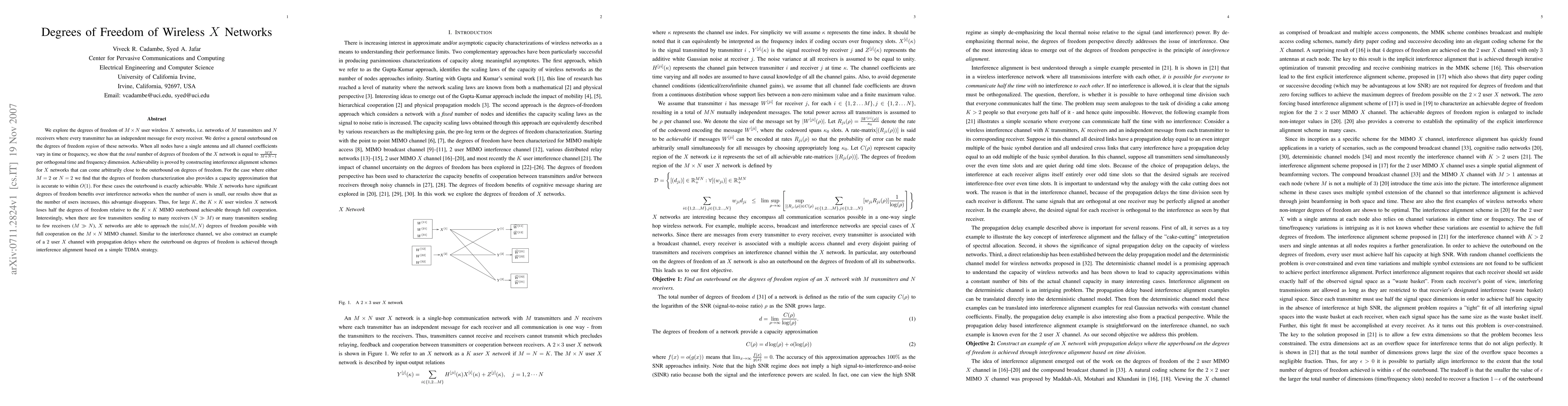 We explore the degrees of freedom of $M\times N$ user wireless $X$ networks, i.e. networks of $M$ transmitters and $N$ receivers where every transmitter has an independent message for every receiver. We derive a general outerbound on the degrees of freedom \emph{region} of these networks. When all nodes have a single antenna and all channel coefficients vary in time or frequency, we show that the \emph{total} number of degrees of freedom of the $X$ network is equal to $\frac{MN}{M+N-1}$ per orthogonal time and frequency dimension. Achievability is proved by constructing interference alignment schemes for $X$ networks that can come arbitrarily close to the outerbound on degrees of freedom. For the case where either M=2 or N=2 we find that the outerbound is exactly achievable. While $X$ networks have significant degrees of freedom benefits over interference networks when the number of users is small, our results show that as the number of users increases, this advantage disappears. Thus, for large $K$, the $K\times K$ user wireless $X$ network loses half the degrees of freedom relative to the $K\times K$ MIMO outerbound achievable through full cooperation. Interestingly, when there are few transmitters sending to many receivers ($N\gg M$) or many transmitters sending to few receivers ($M\gg N$), $X$ networks are able to approach the $\min(M,N)$ degrees of freedom possible with full cooperation on the $M\times N$ MIMO channel. Similar to the interference channel, we also construct an example of a 2 user $X$ channel with propagation delays where the outerbound on degrees of freedom is achieved through interference alignment based on a simple TDMA strategy.