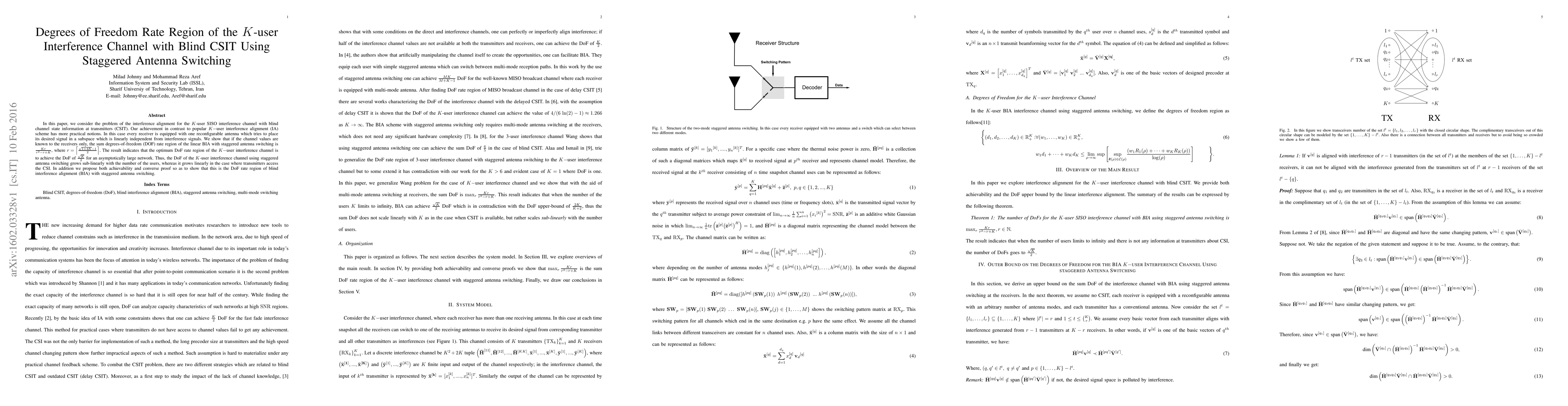 In this paper, we consider the problem of the interference alignment for the $K$-user SISO interference channel with blind channel state information at transmitters (CSIT). Our achievement in contrast to popular $K-$user interference alignment (IA) scheme has more practical notions. In this case every receiver is equipped with one reconfigurable antenna which tries to place its desired signal in a subspace which is linearly independent from interference signals. We show that if the channel values are known to the receivers only, the sum degrees-of-freedom (DOF) rate region of the linear BIA with staggered antenna switching is $\frac{Kr}{r^2-r+K}$, where $r = \left \lceil{\frac{\sqrt{1+4K}-1}{2}} \right \rceil$. The result indicates that the optimum DoF rate region of the $K-$user interference channel is to achieve the DoF of $\frac{\sqrt{K}}{2}$ for an asymptotically large network. Thus, the DoF of the $K$-user interference channel using staggered antenna switching grows sub-linearly with the number of the users, whereas it grows linearly in the case where transmitters access the CSI. In addition we propose both achievability and converse proof so as to show that this is the DoF rate region of blind interference alignment (BIA) with staggered antenna switching.