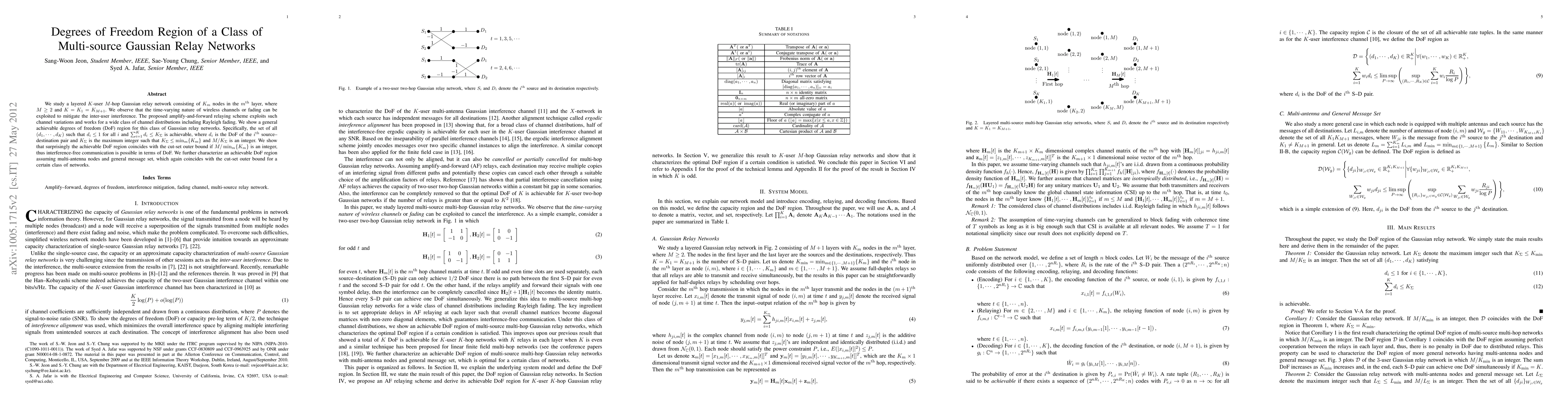 This paper investigates a multi-source Gaussian relay network with $K$ users and $M$ hops, proposing an amplify-and-forward relaying scheme that leverages time-varying wireless channels to mitigate interference. The study establishes a general achievable degrees of freedom (DoF) region, showing that it coincides with the cut-set outer bound under certain conditions, indicating potential for interference-free communication.