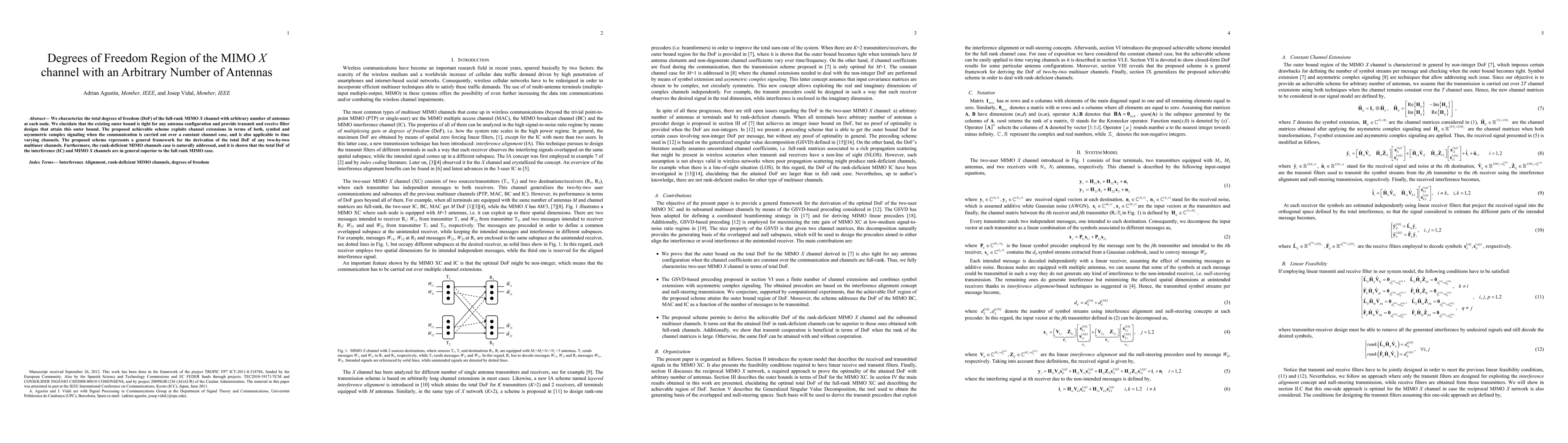 Summary: The paper characterizes the degrees of freedom for MIMO X channels with arbitrary antenna configurations, demonstrating that the existing outer bound is tight and proposing a scheme that achieves it, applicable to both constant and time-varying channels. It also provides a general framework for deriving total DoF for various two-user multi-antenna channels.